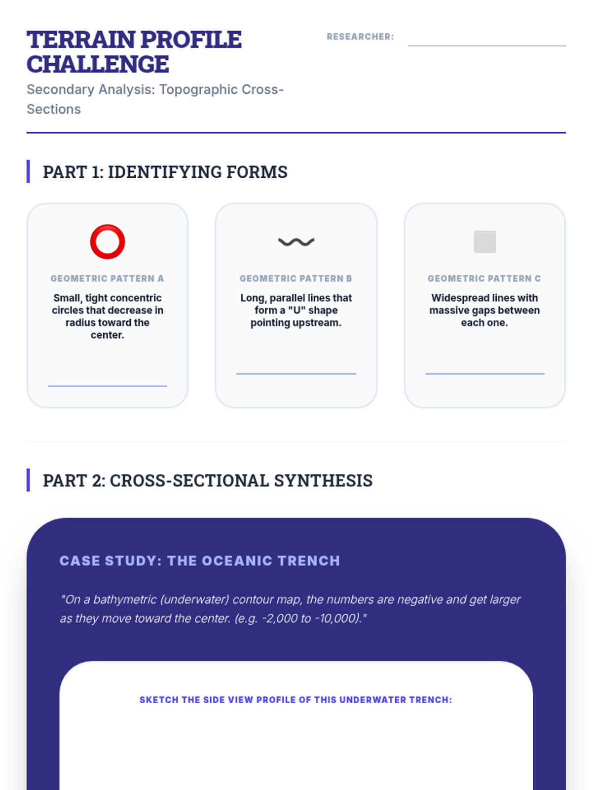 Secondary worksheet for Lesson 3 focusing on topographic pattern recognition and the construction of vertical profiles from contour data.