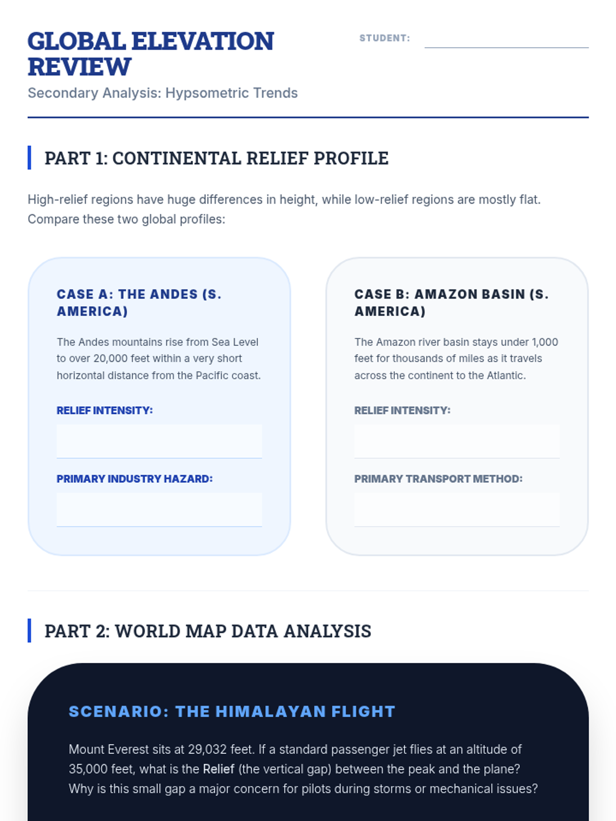 Secondary worksheet for Lesson 2 focusing on global relief comparisons, continental elevation profiles, and mathematical synthesis of flight data relative to world peaks.