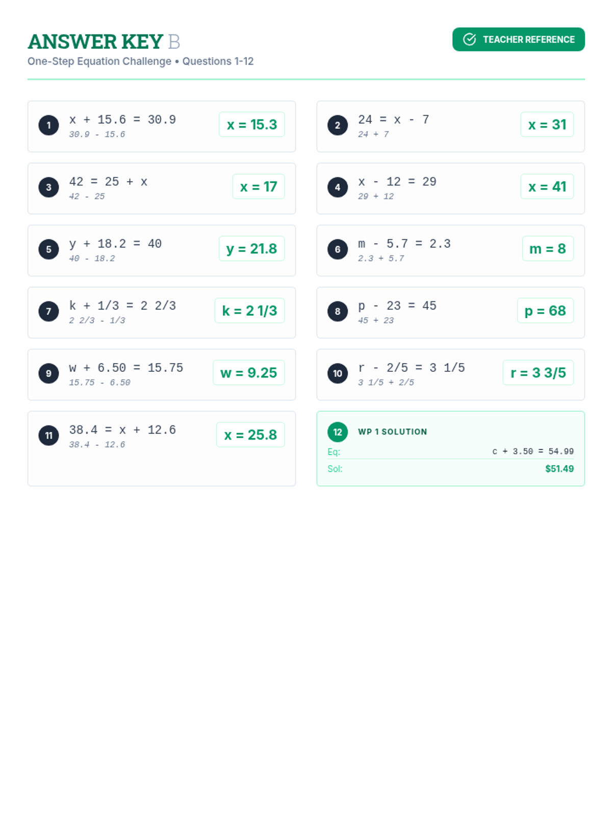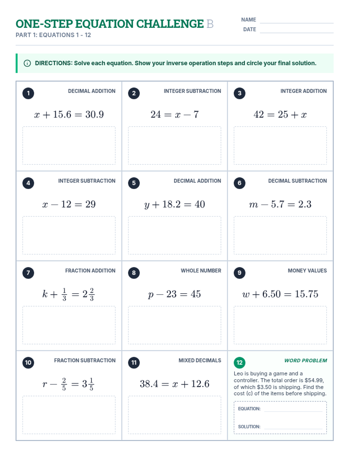 Version B of the One-Step Equation Challenge worksheet, featuring 24 new addition and subtraction problems involving whole numbers, decimals, and fractions, including two word problems. It maintains the same structure and difficulty as Version A but with emerald green accents for differentiation.