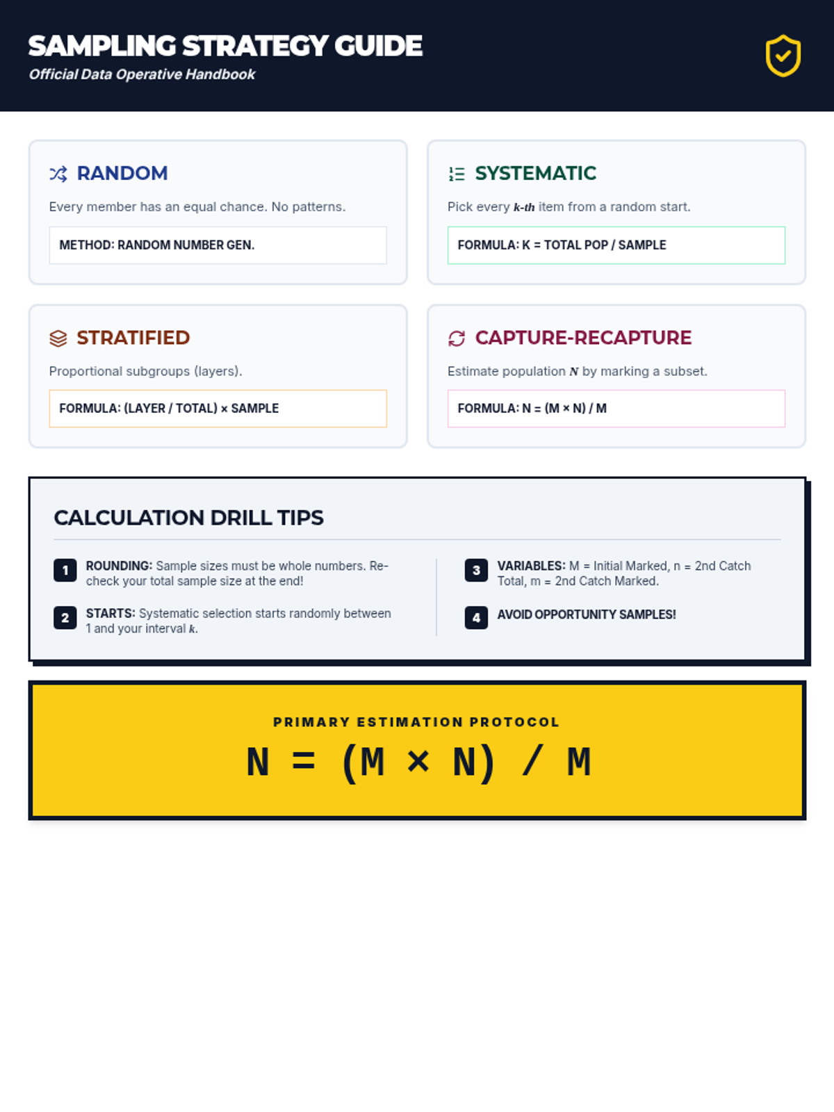 A quick-reference 'cheat sheet' for Year 8 students, summarizing the formulas and methods for random, systematic, stratified, and capture-recapture sampling.