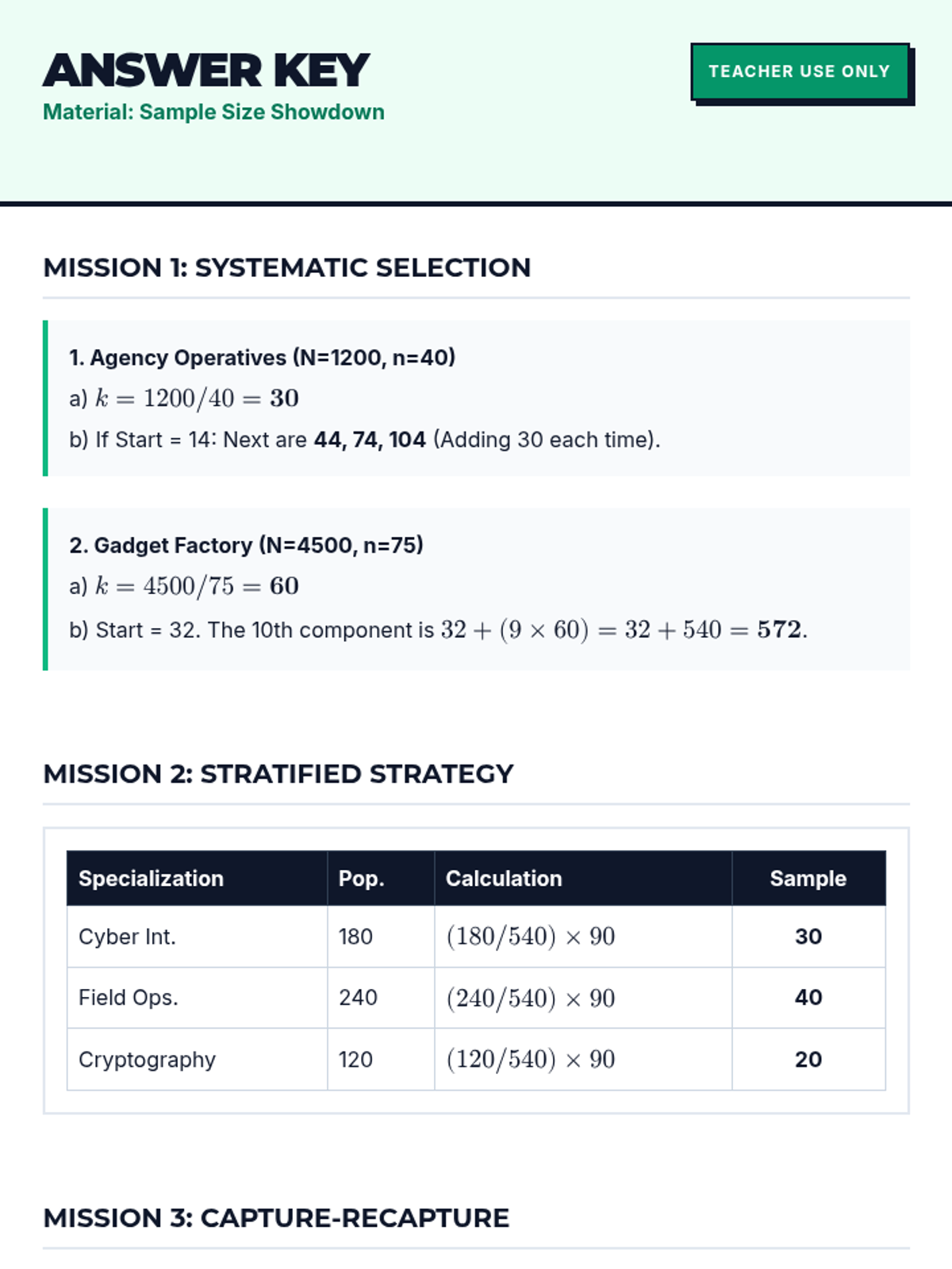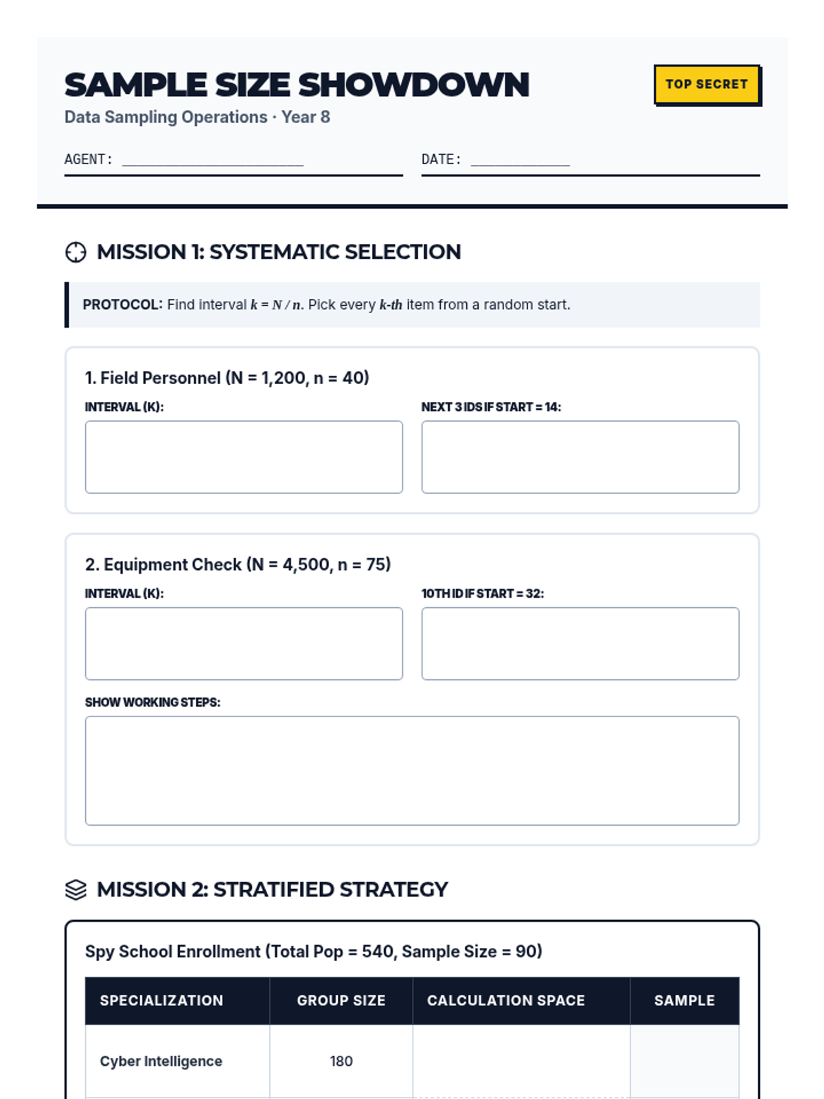 A Year 8 math worksheet titled 'Sample Size Showdown' focused on sampling calculations, including systematic, stratified, and capture-recapture methods, with a secret agent theme.