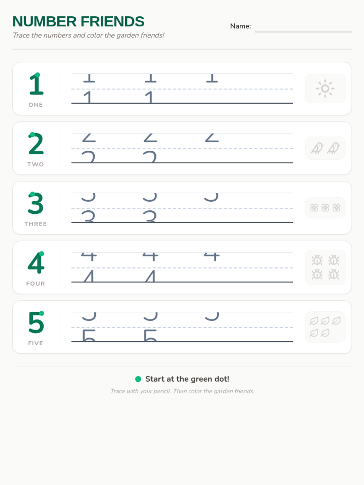 A number tracing worksheet for numbers 1-5 with a garden theme, featuring directional cues, dotted lines for practice, and visual objects for counting.