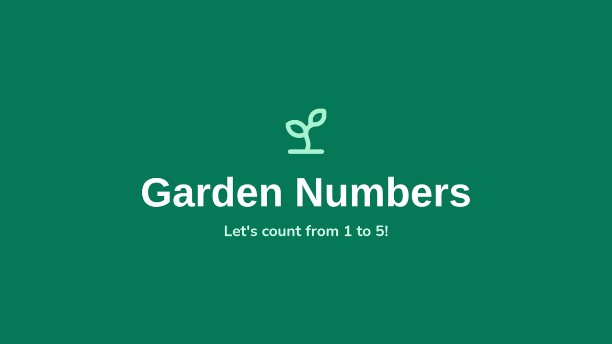 A visual presentation for teaching numbers 1-5 to Kindergarten MLL students, featuring large numbers, word forms, and garden-themed objects for group counting.