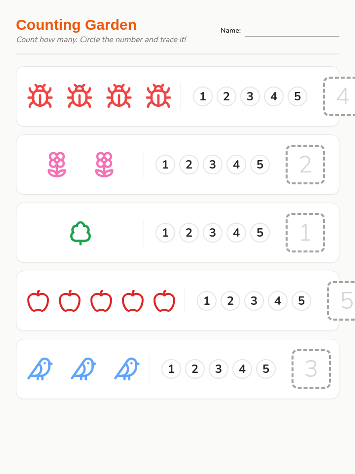 A counting worksheet for numbers 1-5 where students count garden-themed objects, circle the corresponding number, and write the digit in a box.