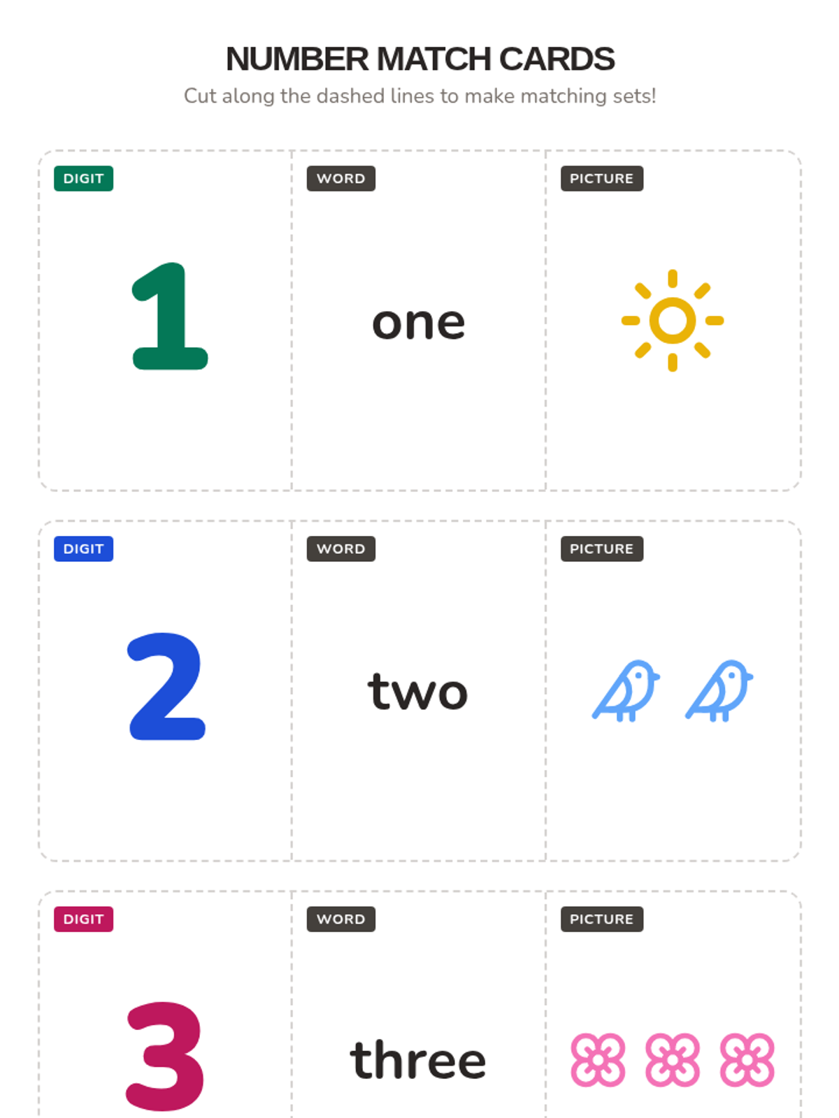 A set of printable number matching cards featuring digits, number words, and quantities for numbers 1-5, designed for MLL students to practice recognition and correspondence.