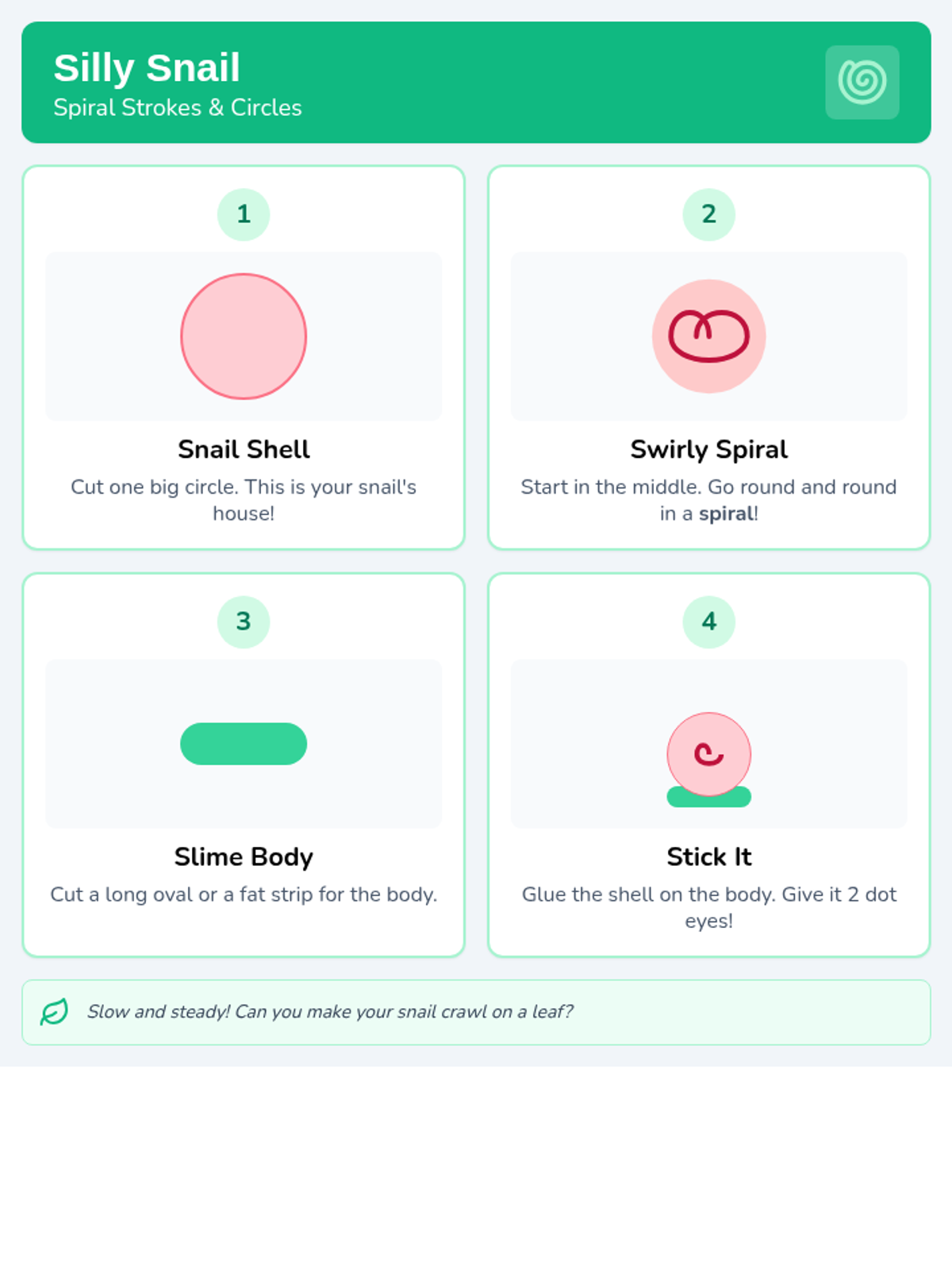 A step-by-step visual instruction card for making a paper snail, focusing on spiral strokes and circles.