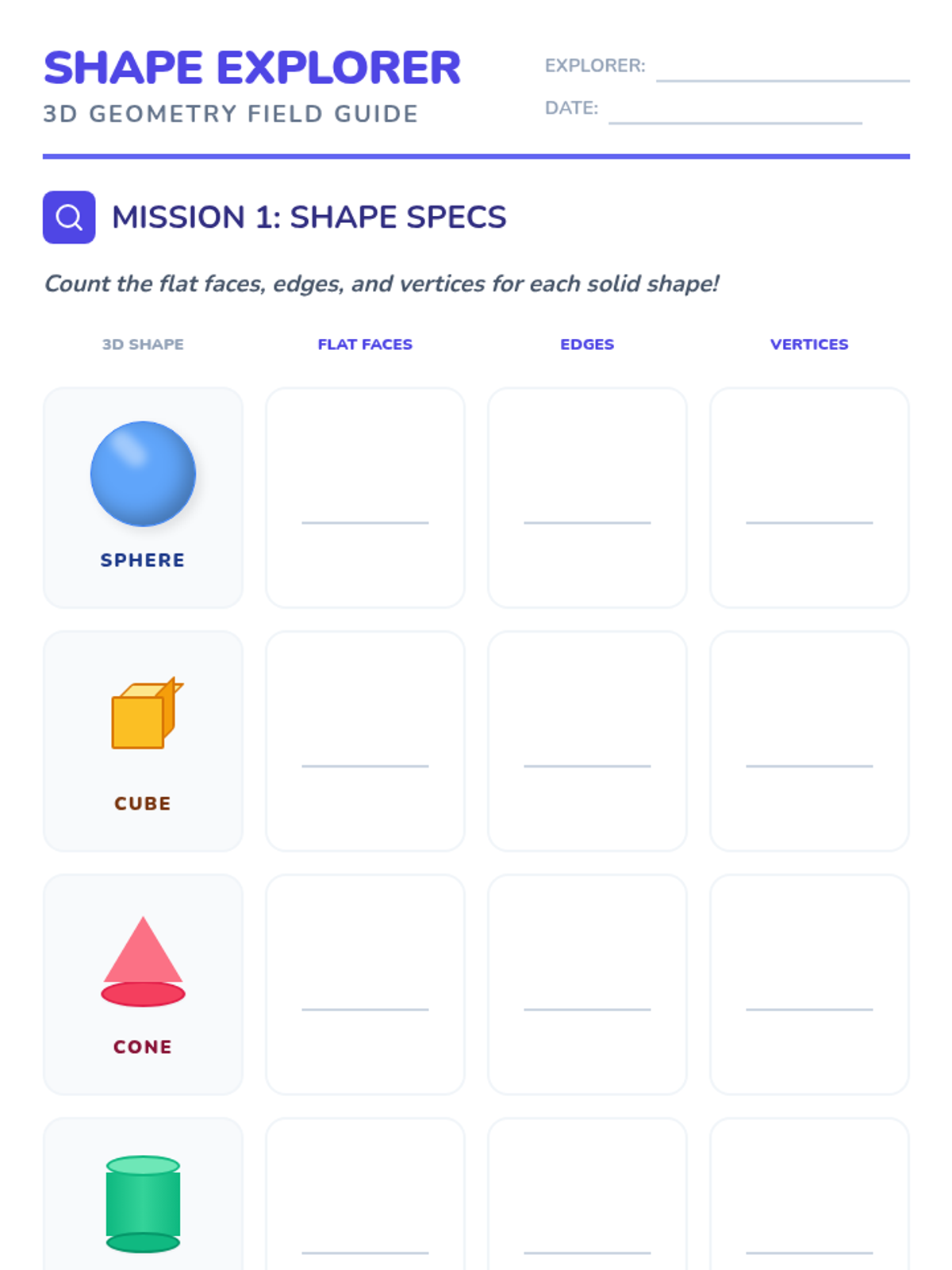 A vibrant 'Shape Explorer' worksheet for 1st-grade students to document 3D shape properties (faces, edges, vertices) and identify component shapes in composite structures.
