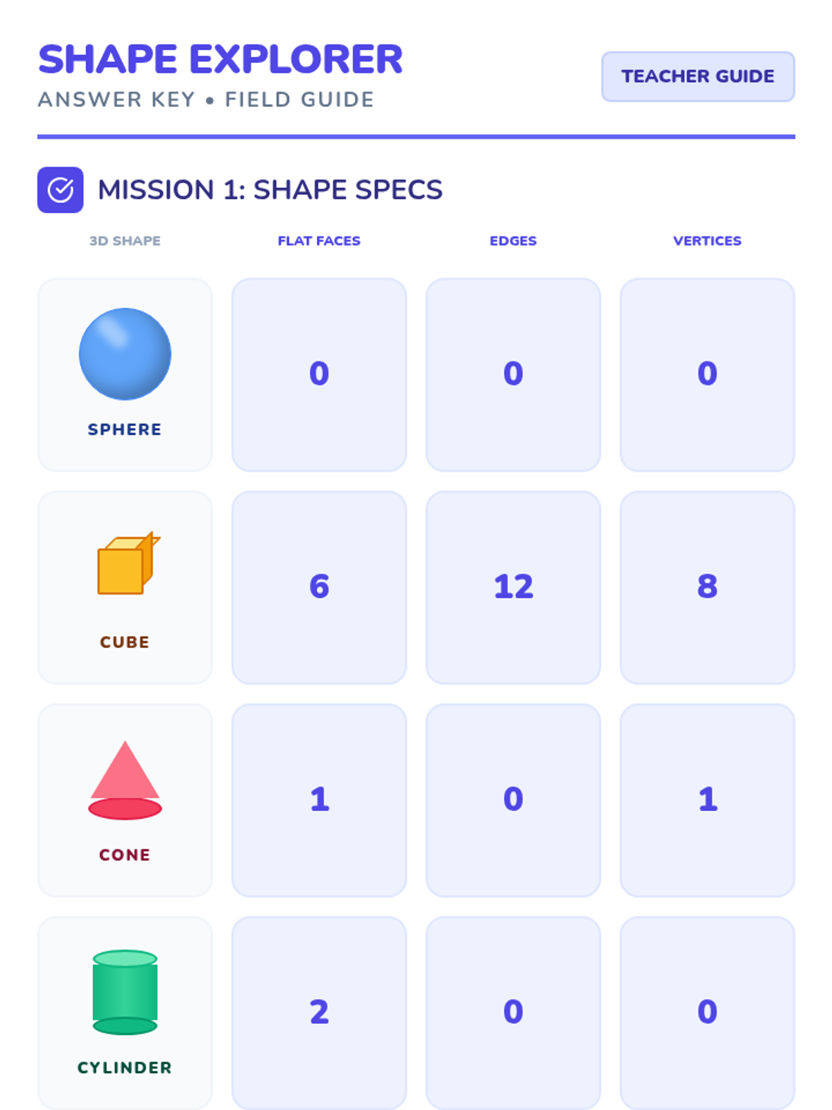 Comprehensive answer key for the Shape Explorer worksheet, featuring clear counts for 3D shape properties and identified component shapes for each construction.