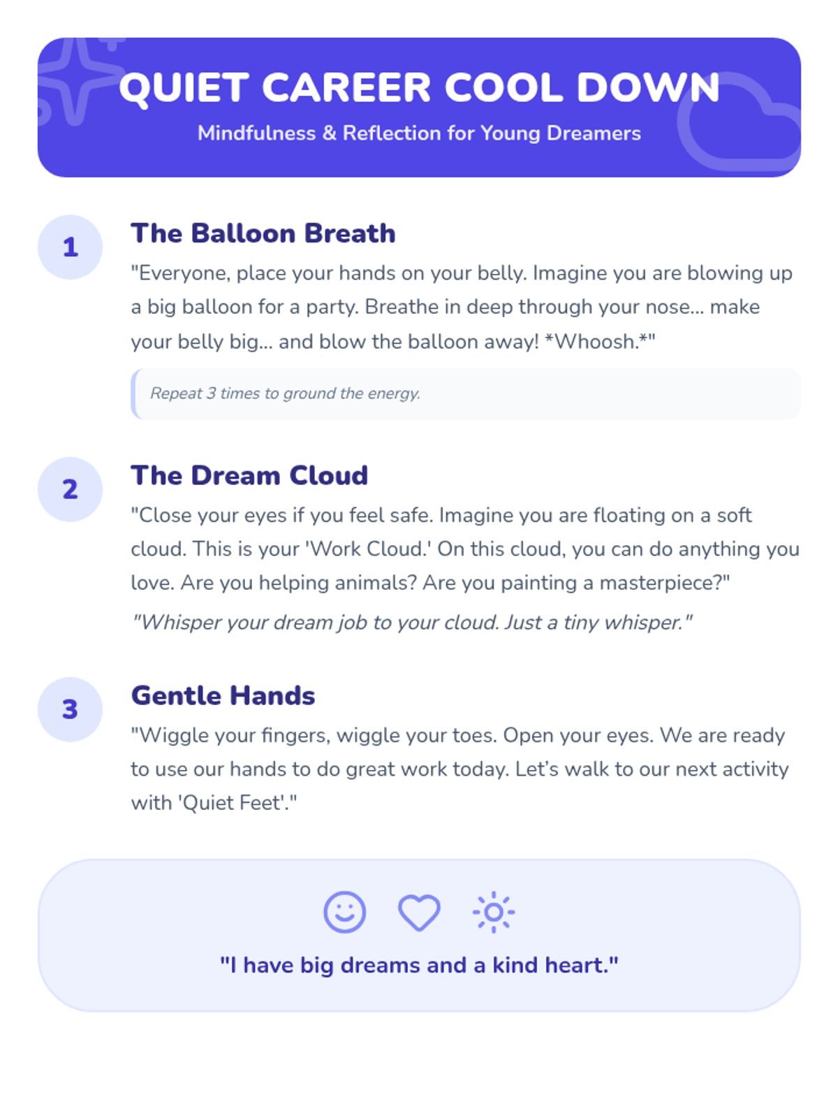 A mindfulness-based cool down activity guide to help Pre-K students transition from an active lesson to a quiet state while reflecting on their future aspirations.