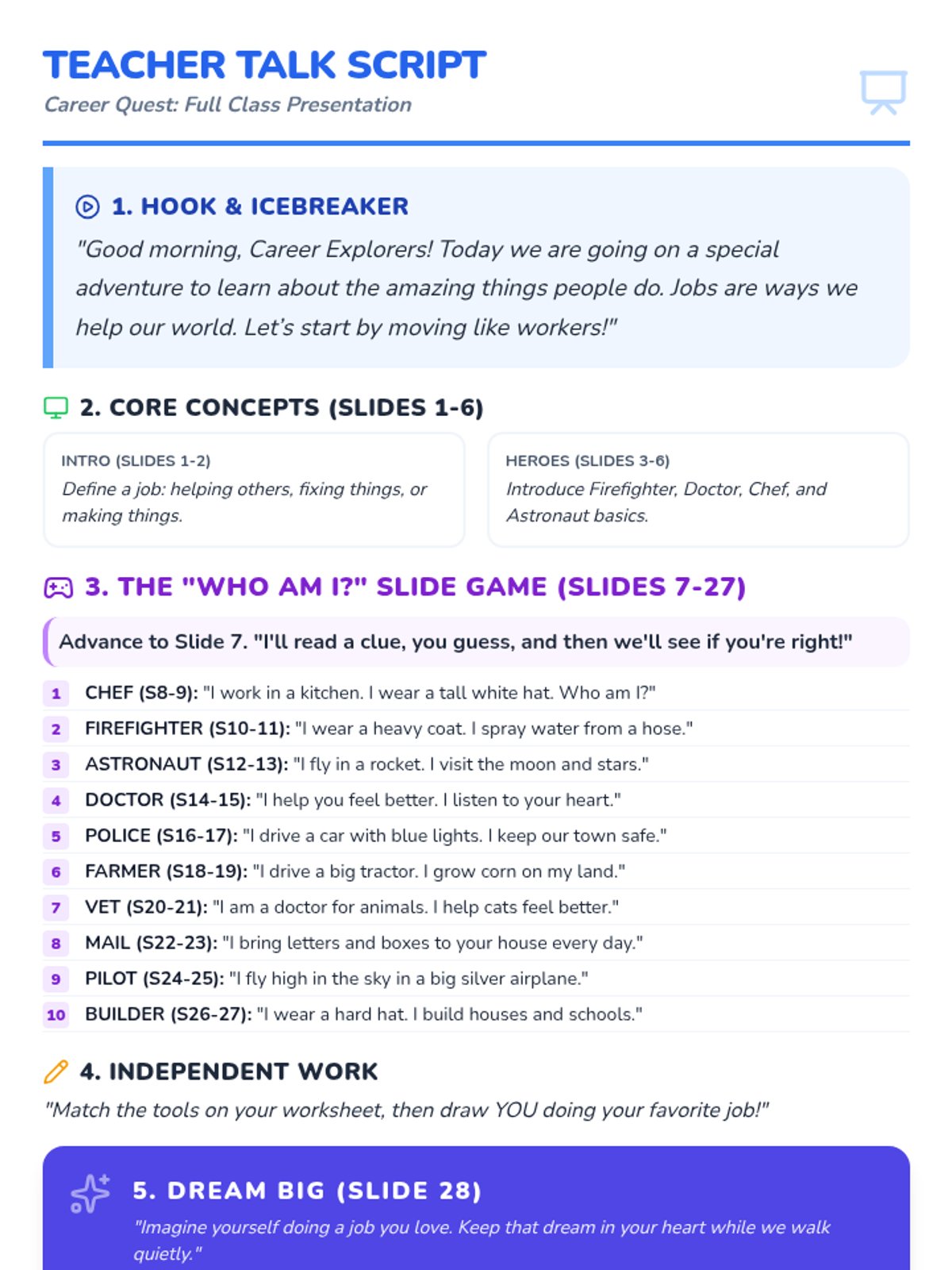 A detailed instructional script for teachers to facilitate the Career Quest lesson, including narration for slides, interactive prompts, and transition cues.