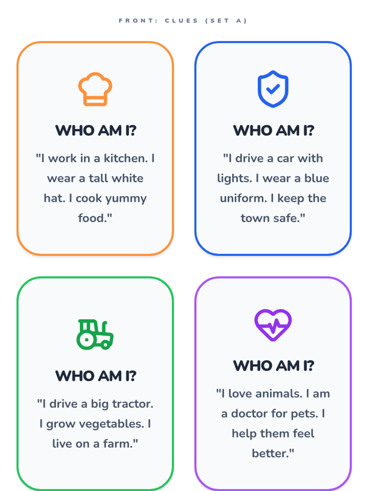 Large, printable "Who Am I?" game cards featuring riddles and picture clues for various community helpers, designed for interactive whole-group play.