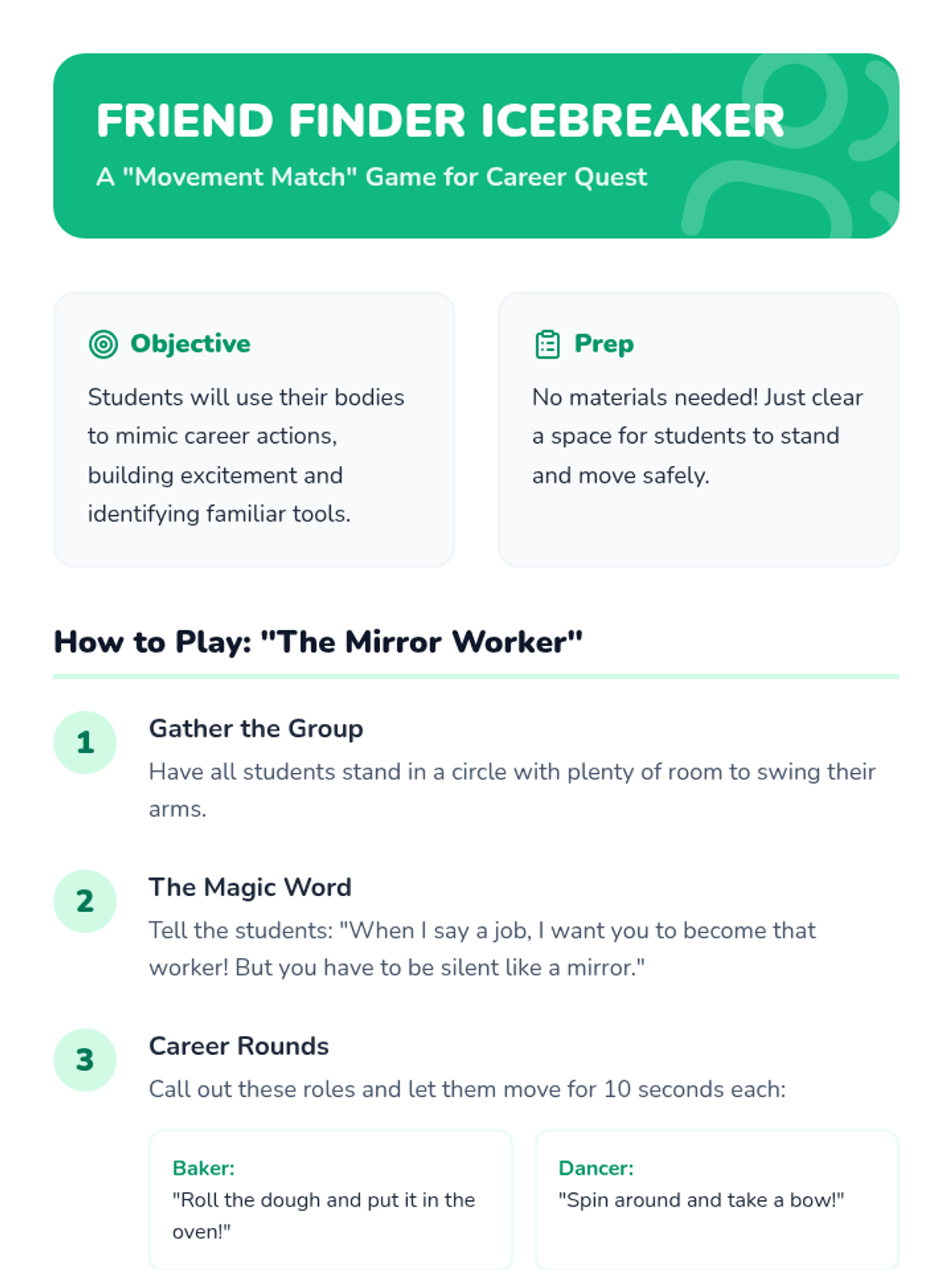 A movement-based icebreaker activity guide designed to get Pre-K students engaged and excited about different career roles through miming and play.