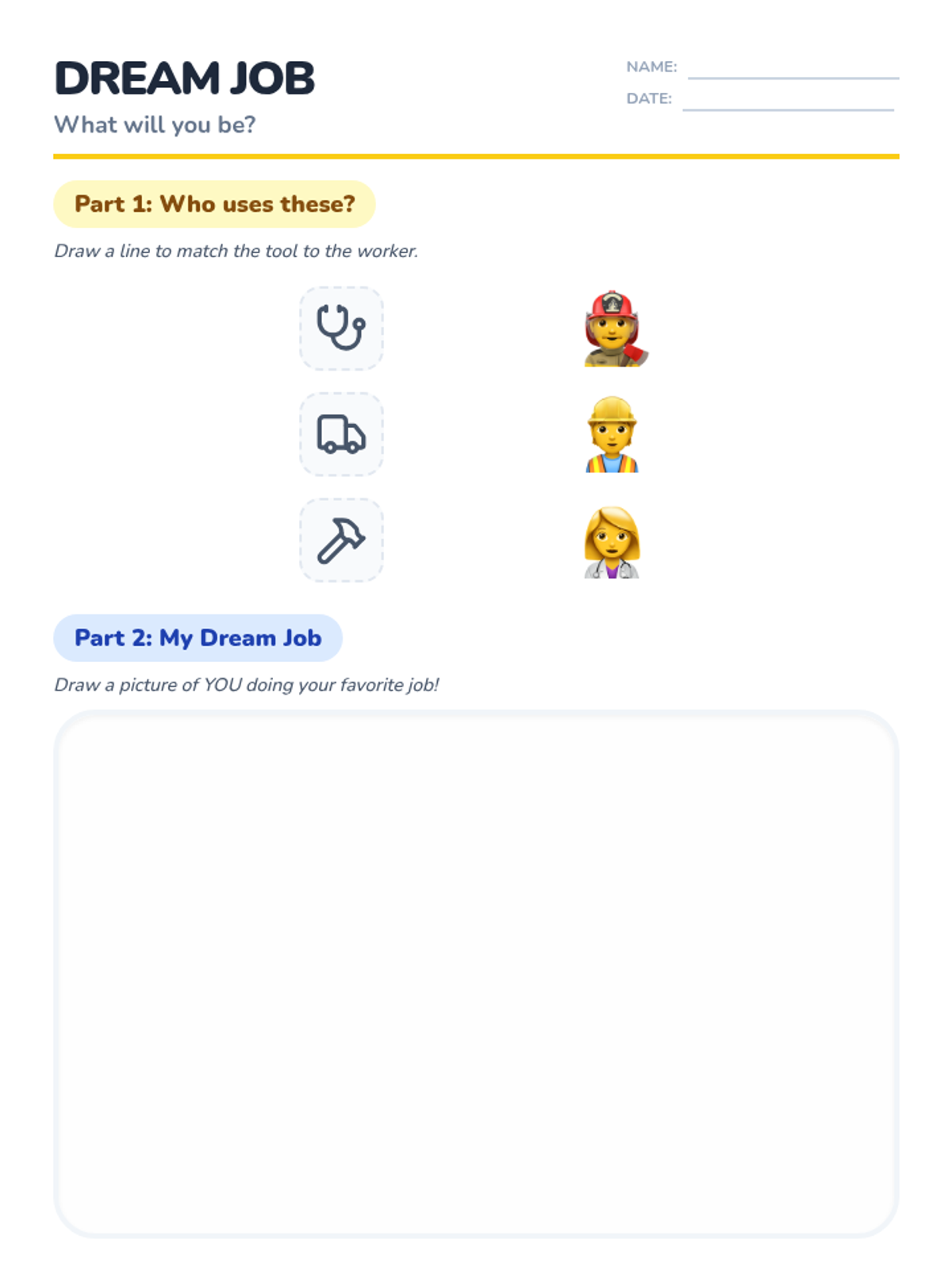 A creative student worksheet for Pre-K learners featuring a matching activity and a large space for drawing their future career aspirations.
