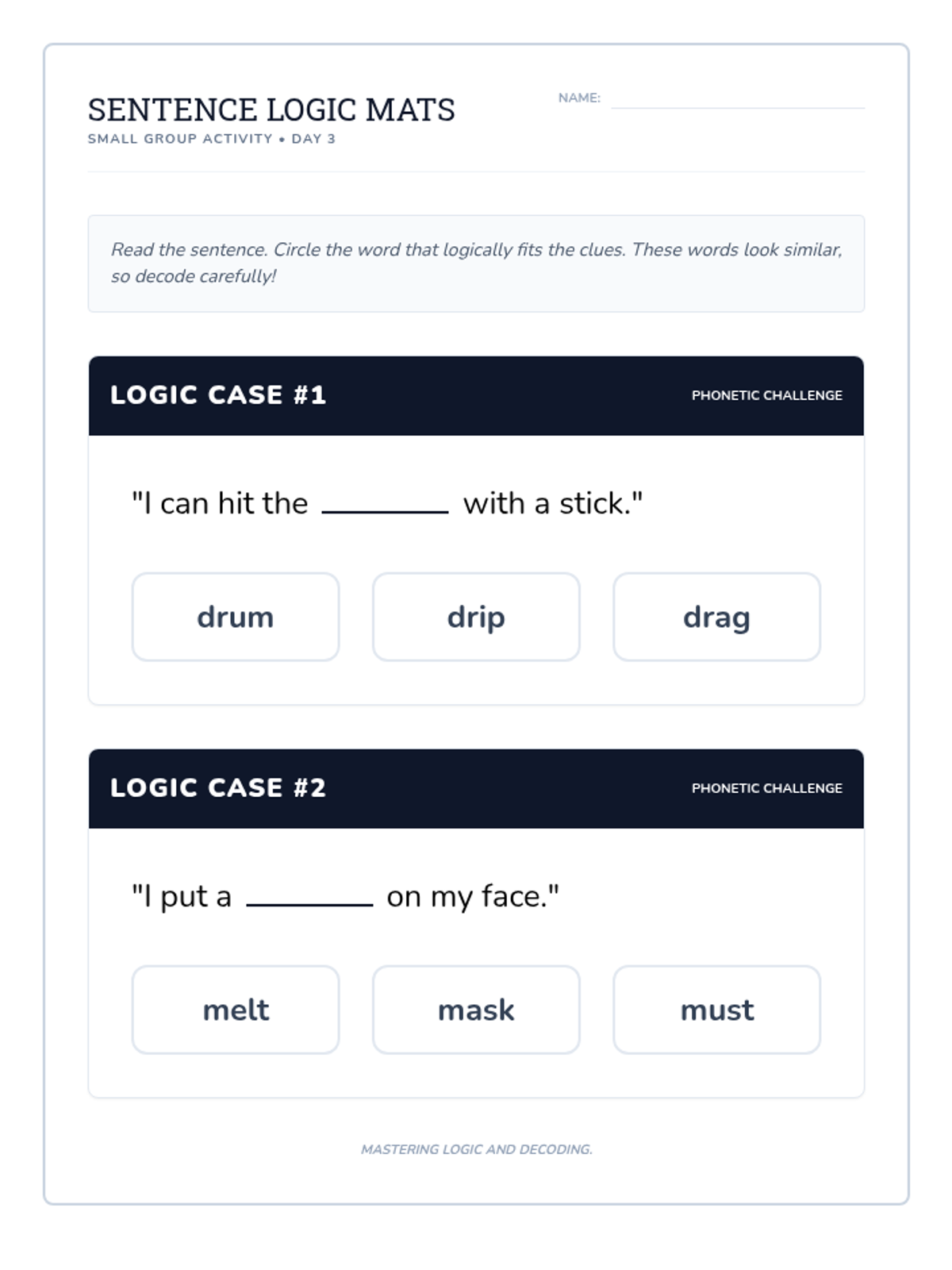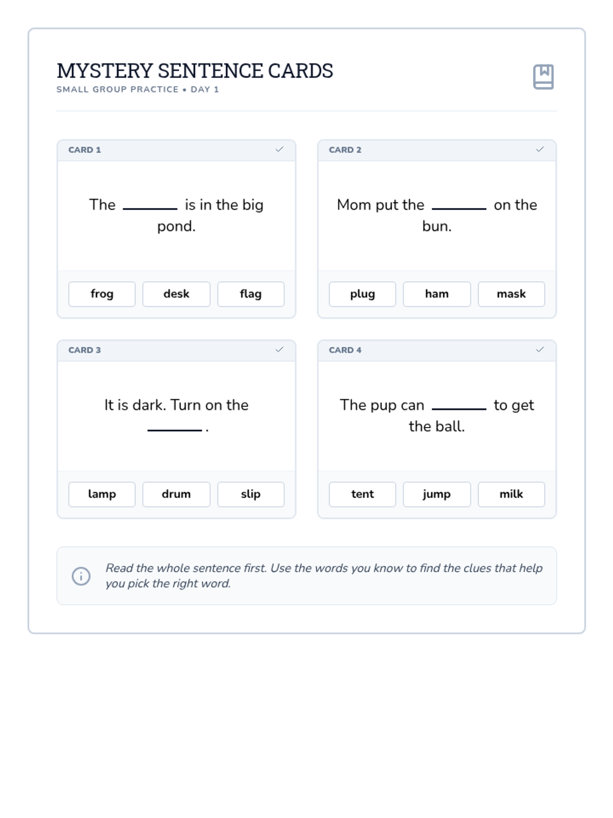 An expanded set of 8 printable mystery cards for small group practice. Each card features a sentence with a missing decodable word and three choices to build context clue skills across two pages.