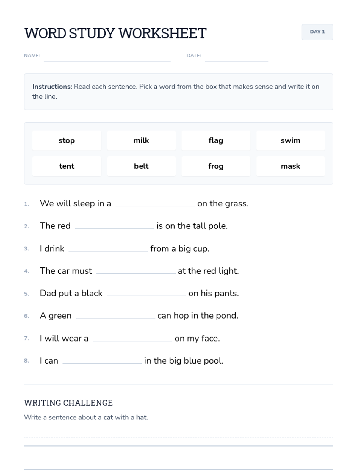 An independent practice worksheet where students apply context clue strategies to complete sentences using a word bank of CCVC and CVCC words.
