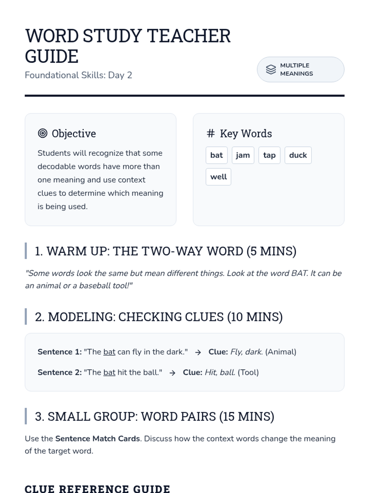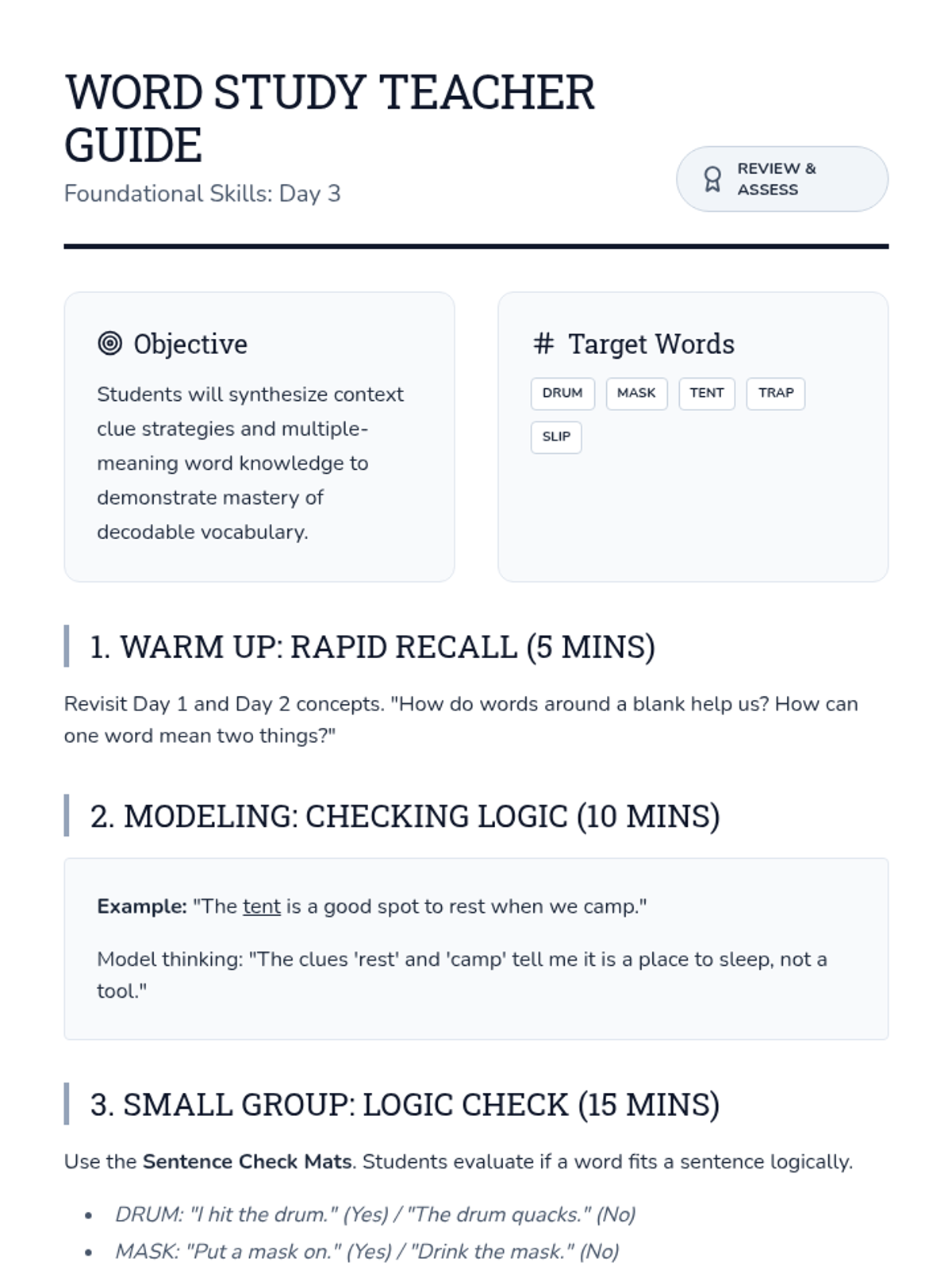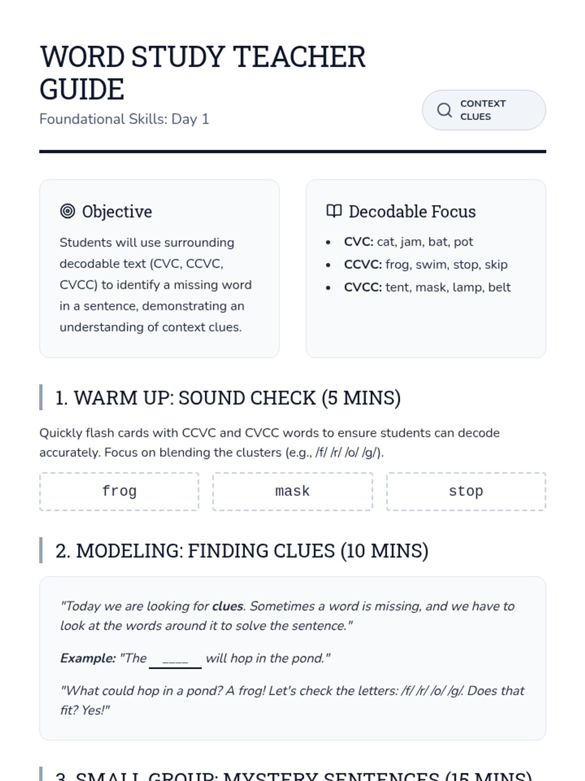 A detailed instructional guide for teachers to lead Day 1 of the Word Study sequence, focusing on using context clues with decodable text.