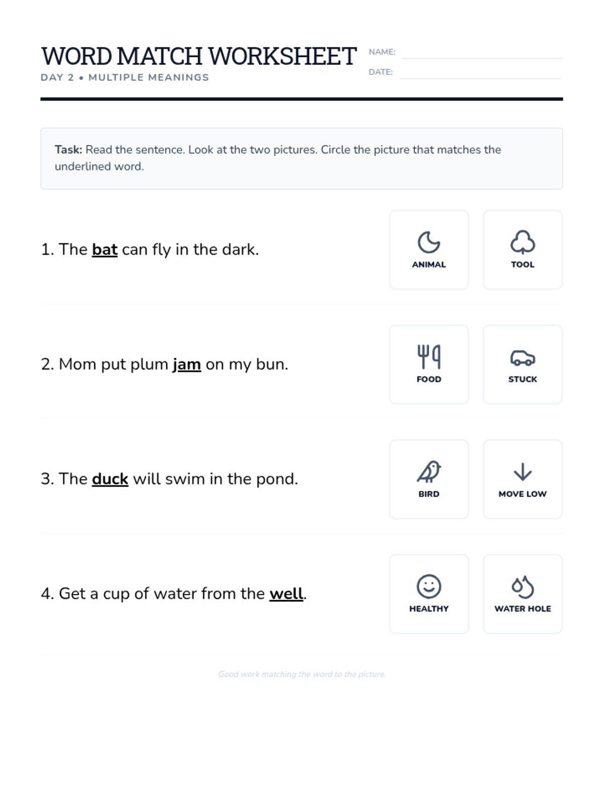 A worksheet for practicing multiple-meaning words where students must identify the correct definition based on sentence context using visual aids.