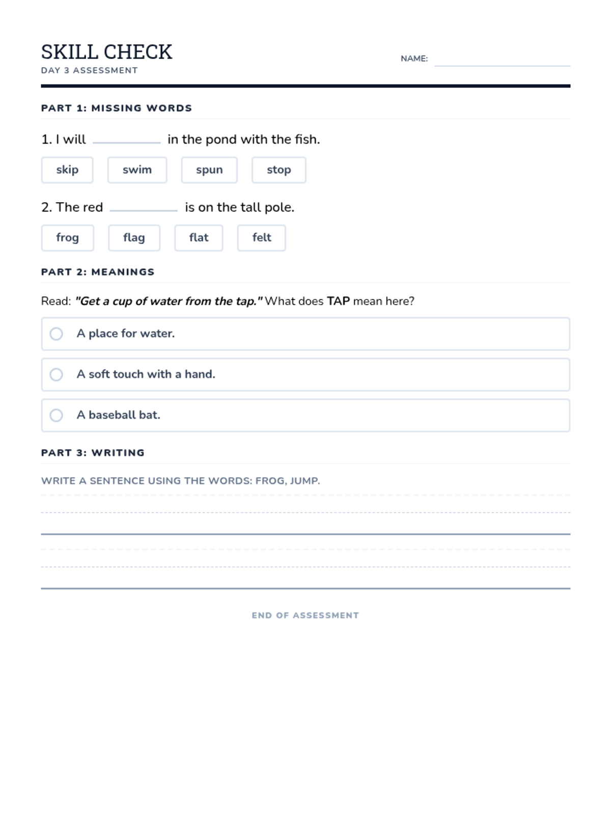 A summative exit ticket assessing context clues, multiple-meaning words, and decodable reading skills. Features multiple-choice and short-writing components.