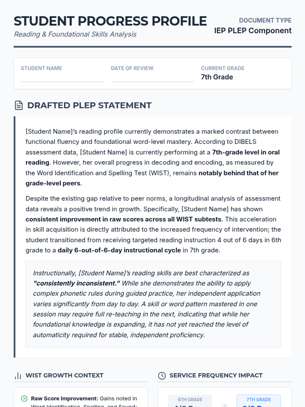 A professional teacher resource providing a drafted IEP PLEP statement for a 7th-grade student. It details reading progress, WIST raw score improvements, and the direct impact of increased instructional frequency while addressing the student's inconsistent skill application.