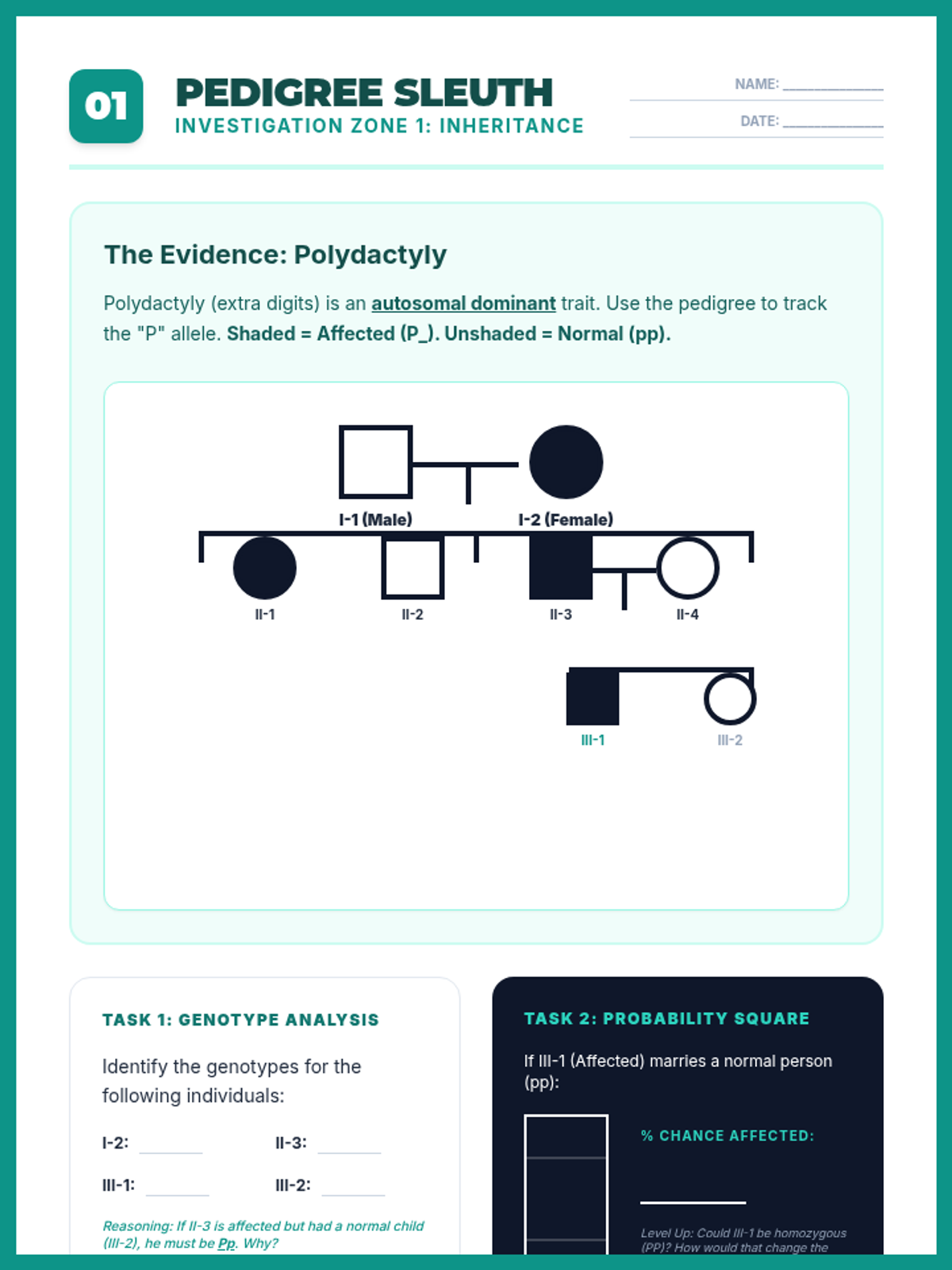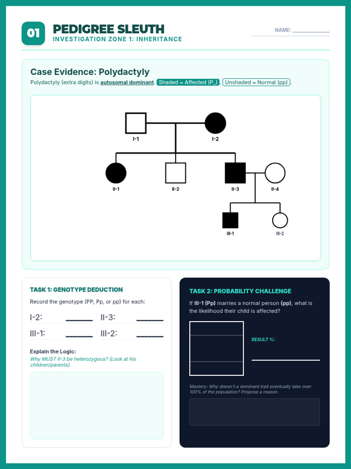 Combined station worksheet for Zone 1: Pedigree Sleuth. Integrates instructions, pedigree evidence, and student response areas into a single-page document. Focuses on autosomal dominant inheritance and genotype deduction. Fixes pedigree line disconnections and page overflow.