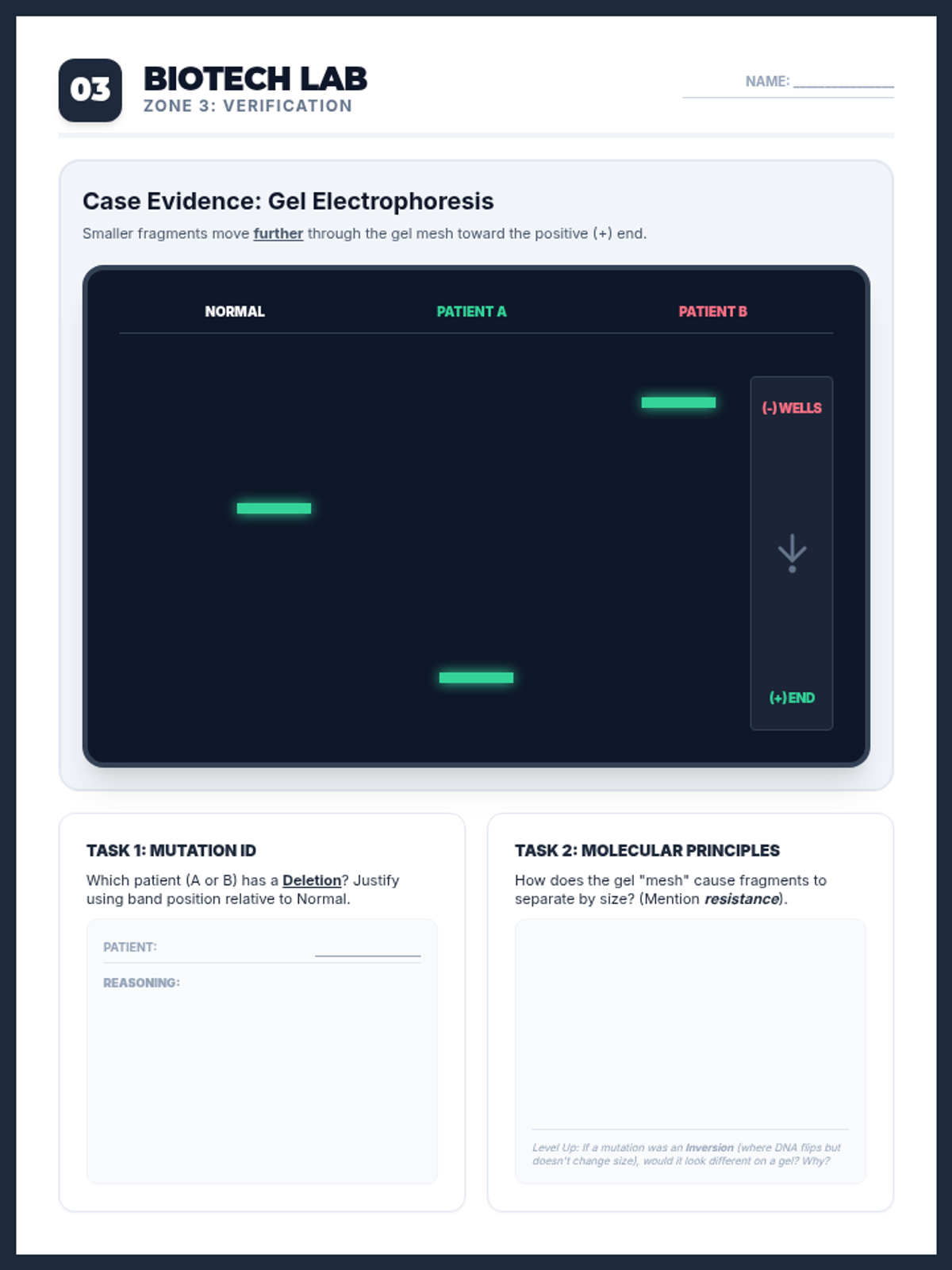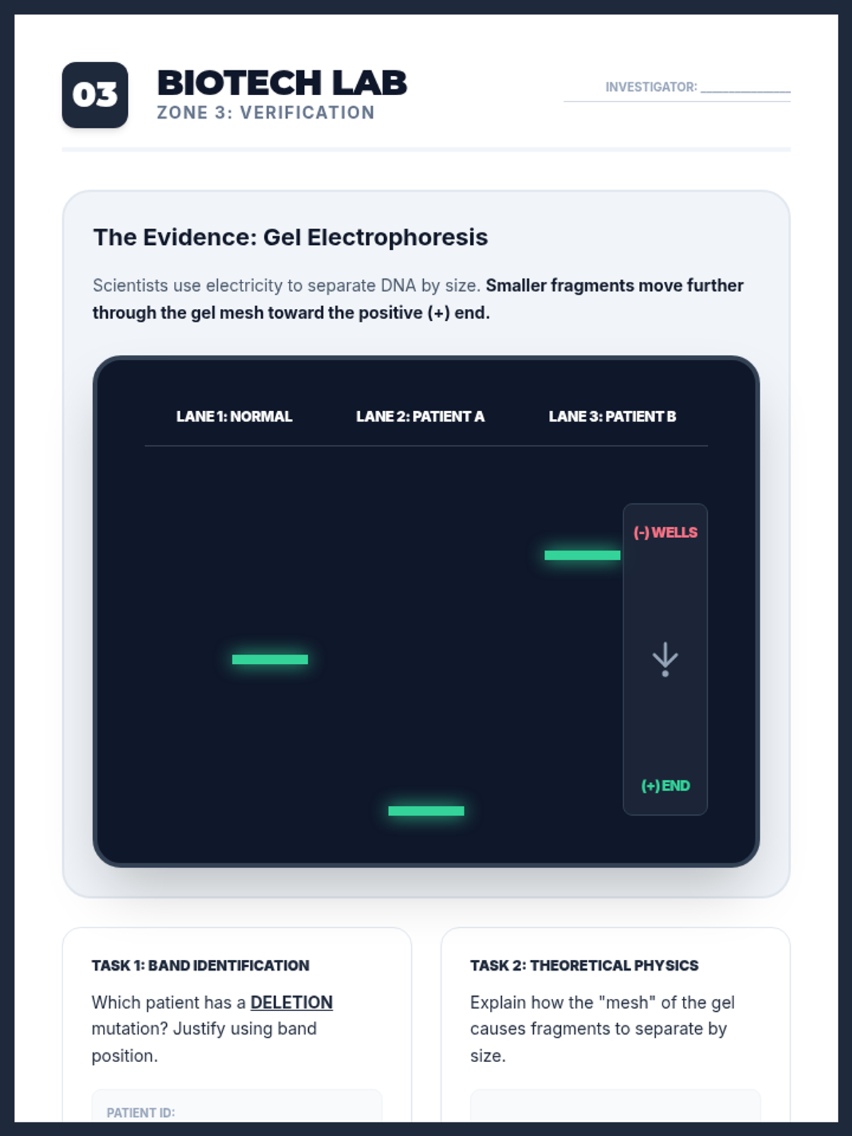 Combined station worksheet for Zone 3: Biotech Lab. Integrates instructions, gel electrophoresis evidence, and student response areas into a single-page document. Focuses on fragment size analysis and molecular separation principles. Fixes layout cutoff issues and expands work areas.