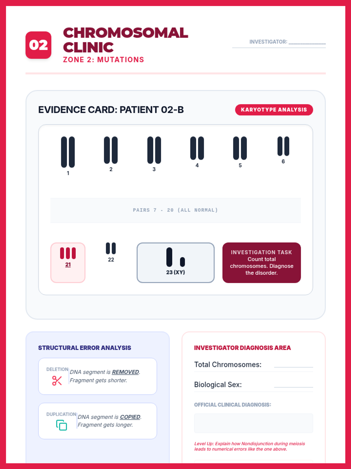 Combined station worksheet for Zone 2: Chromosomal Clinic. Integrates karyotype evidence (Patient 02-B) and structural mutation concepts with student response areas. Focuses on diagnosing aneuploidy and understanding structural changes.