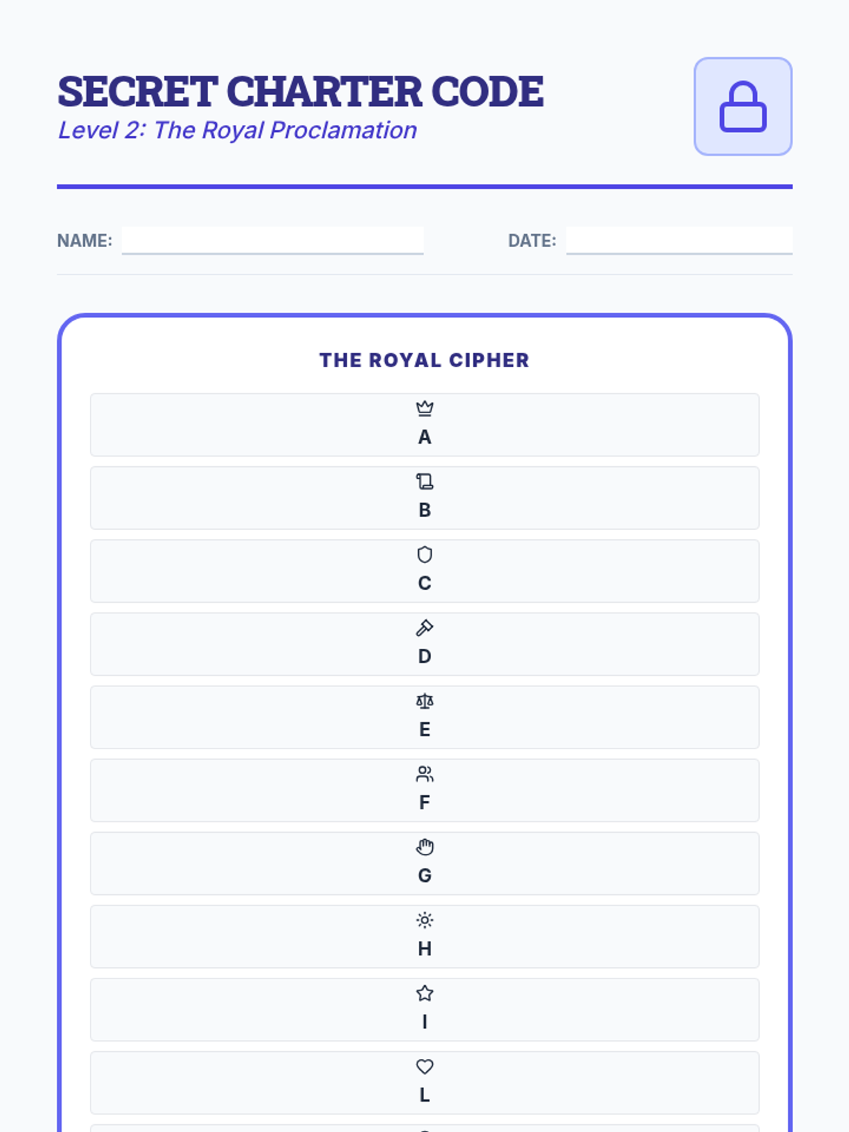 An advanced icon-based cipher puzzle with a longer phrase and a more complex key to challenge students.
