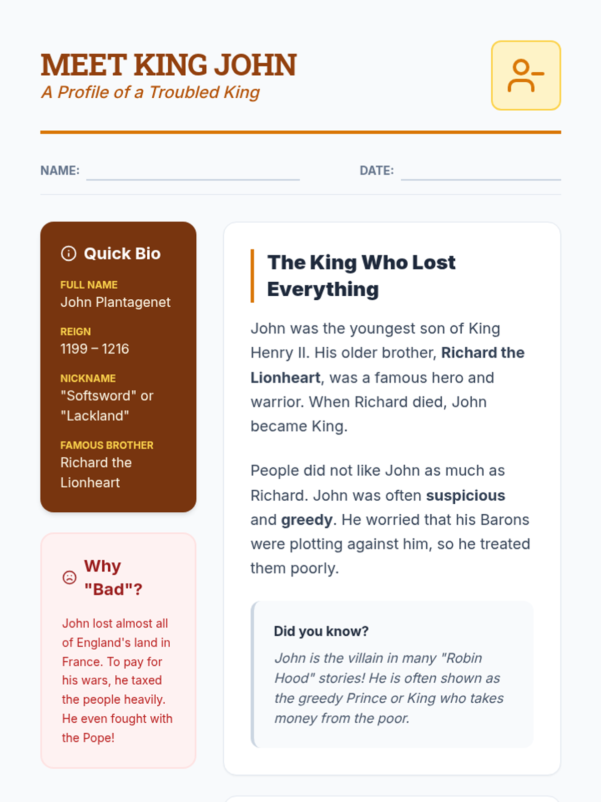 A biographical profile of King John, explaining his family background, his nickname, and why he was considered a "bad" king to provide more context for the Magna Carta.