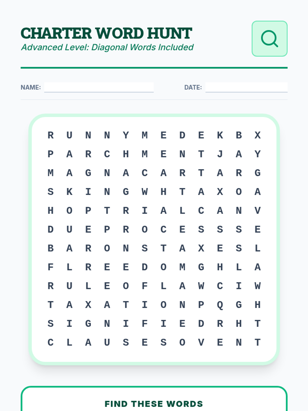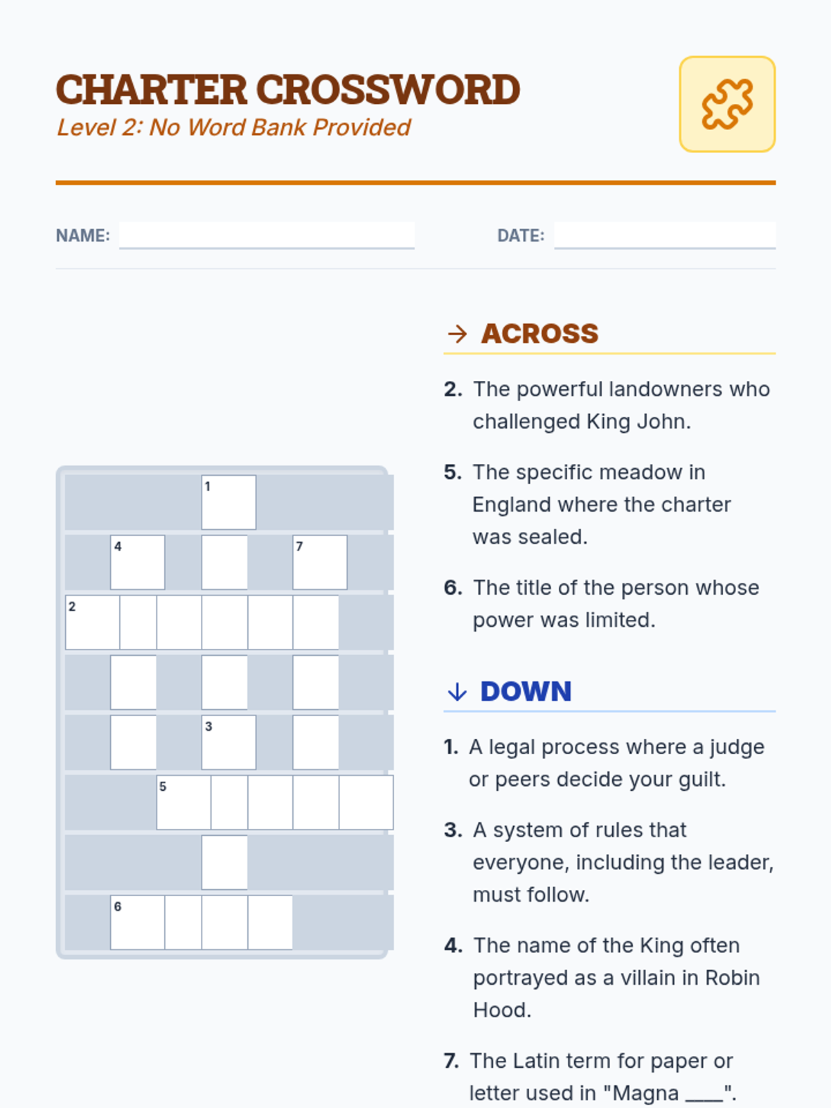 An advanced version of the Magna Carta crossword puzzle with more descriptive clues and the word bank removed for a higher challenge.