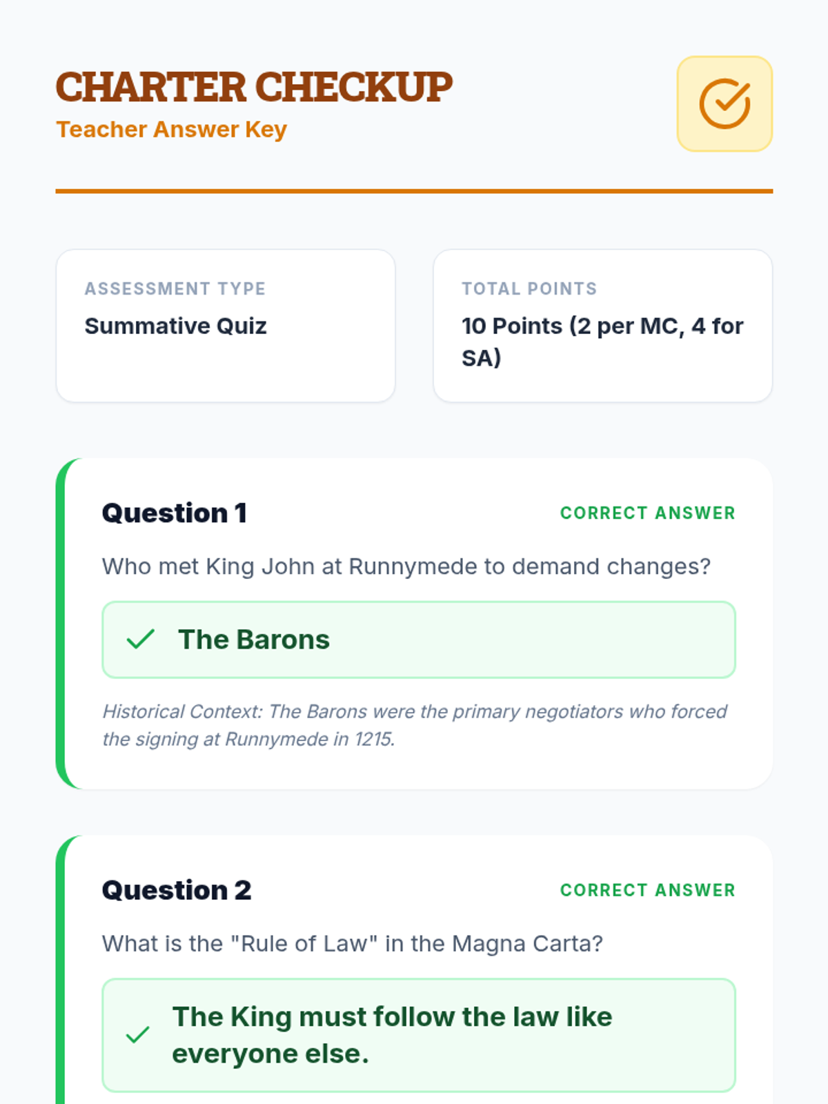 A teacher-facing answer key for the Charter Checkup Quiz, providing correct answers and brief explanations for each question.