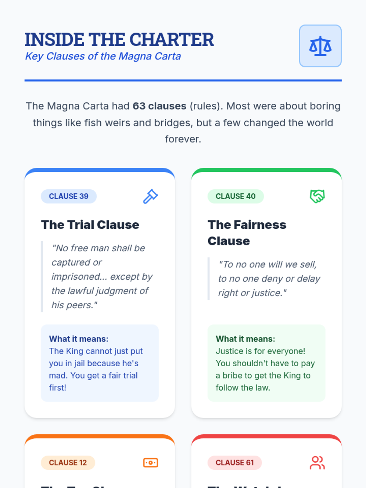 A deeper look at four specific clauses of the Magna Carta (39, 40, 12, and 61) translated into simple language for students to understand the actual mechanics of the document.