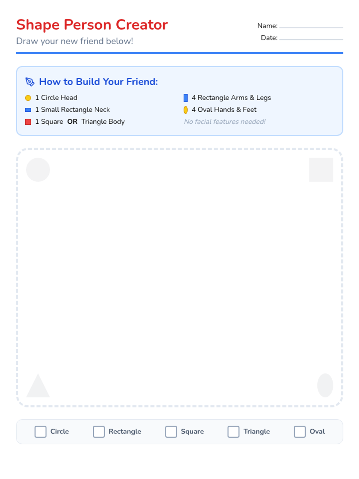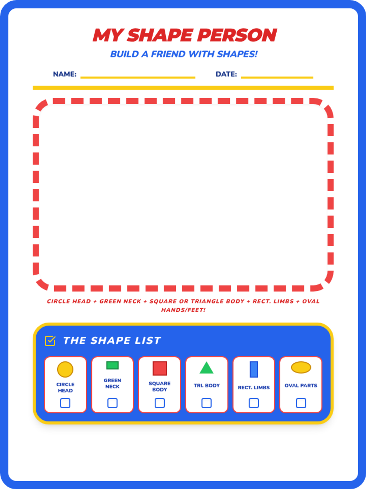 A companion worksheet for students to draw their own Shape Person, featuring a large drawing area and a shape checklist to reinforce geometric recognition.