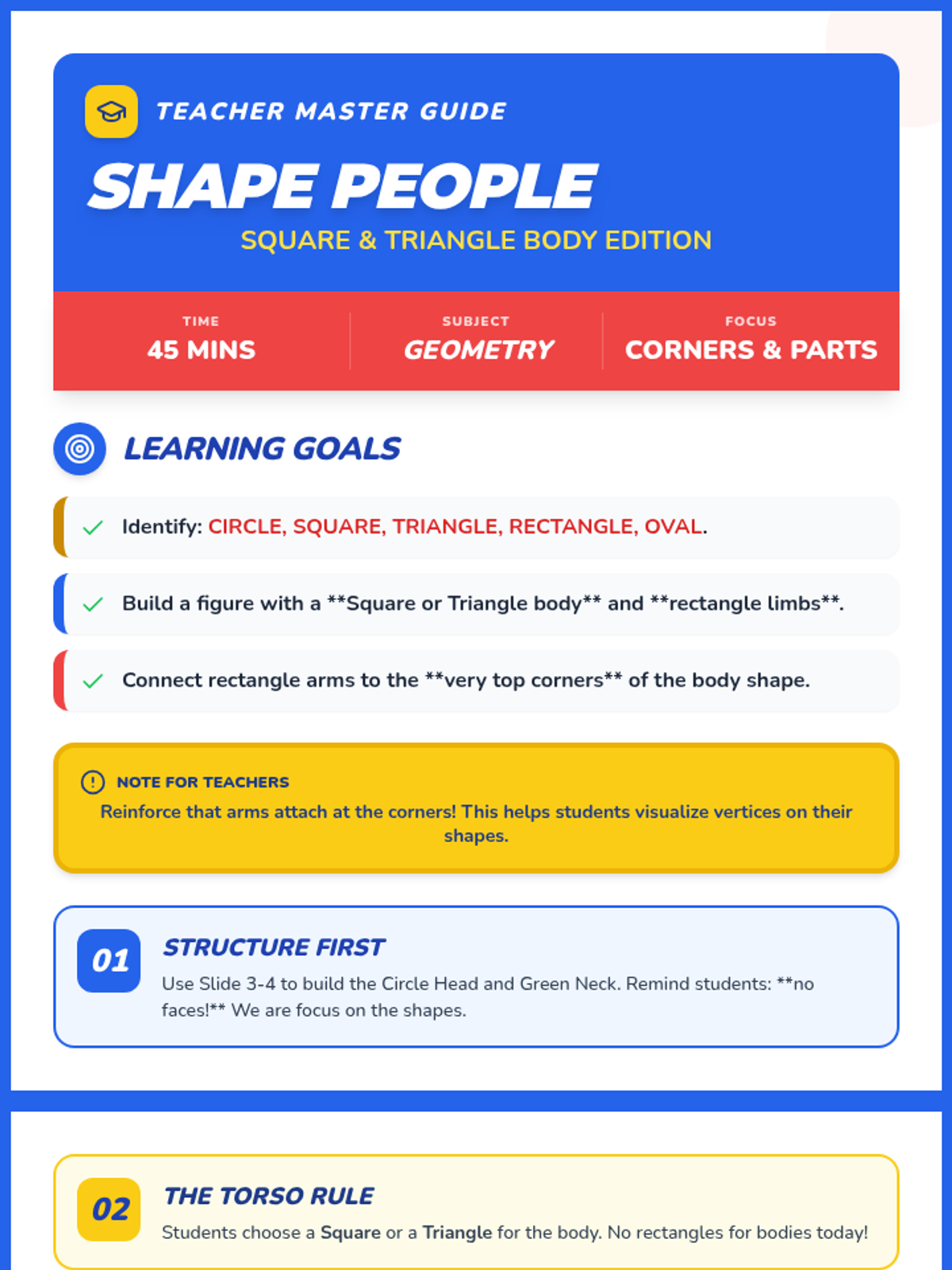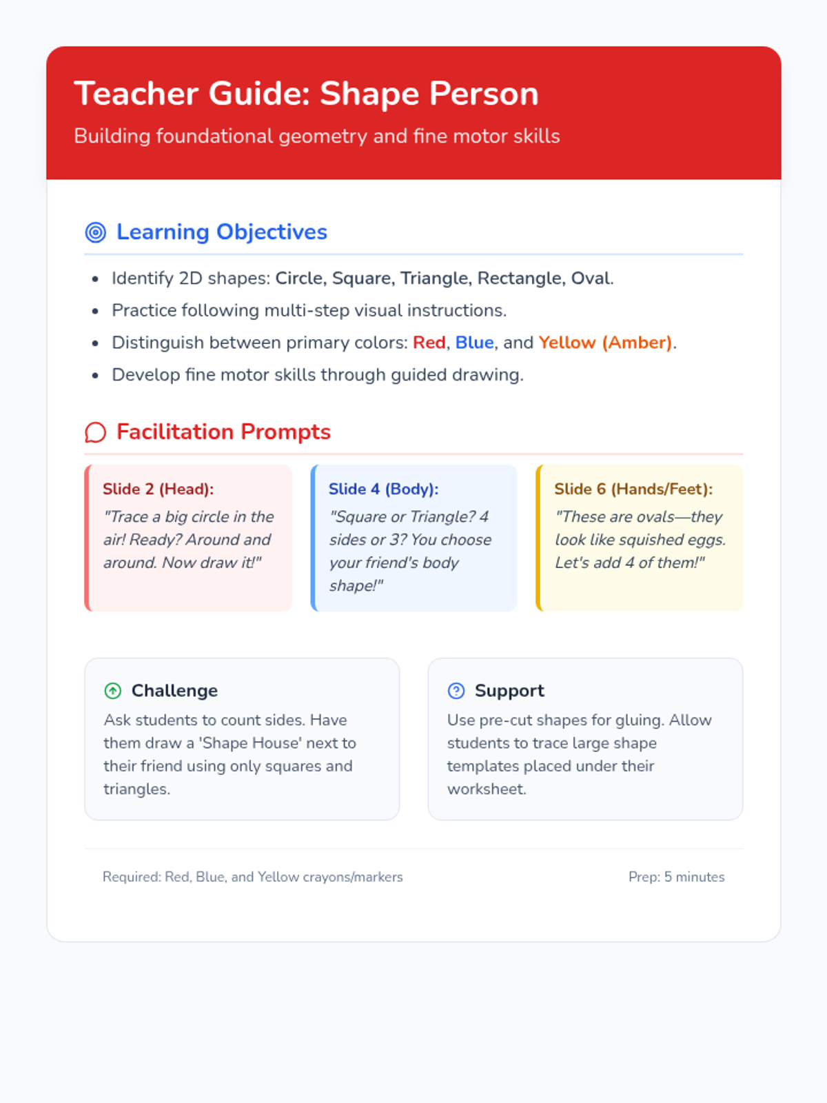 A comprehensive teacher guide for the Shape Person lesson, including learning objectives, facilitation prompts, and differentiation strategies for kindergarten learners.