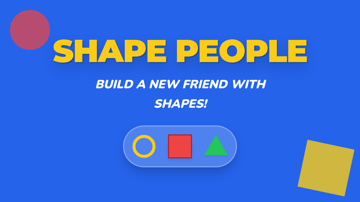 A vibrant 8-slide presentation that guides kindergarten students through drawing a 'Shape Person' step-by-step using primary colors and basic geometric shapes.