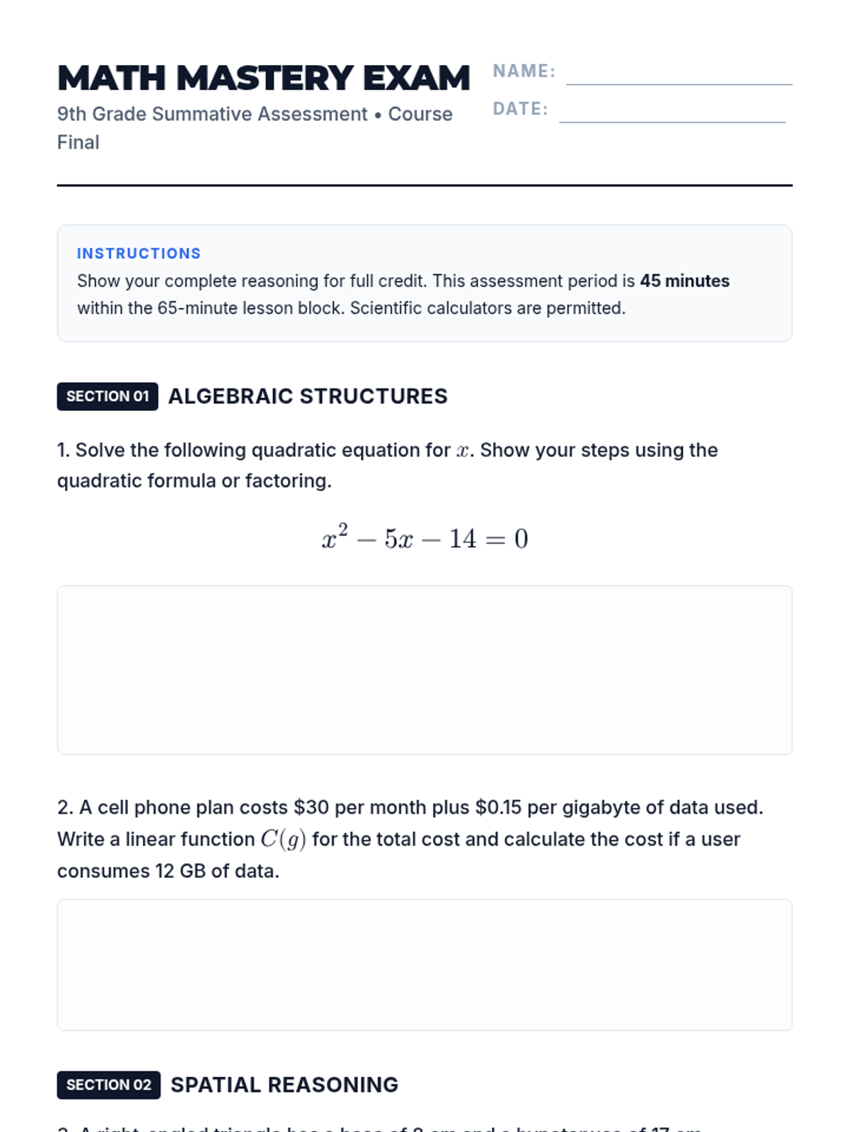 A multi-section summative assessment for 9th-grade math, covering algebra, geometry, and statistics with dedicated space for student reasoning.