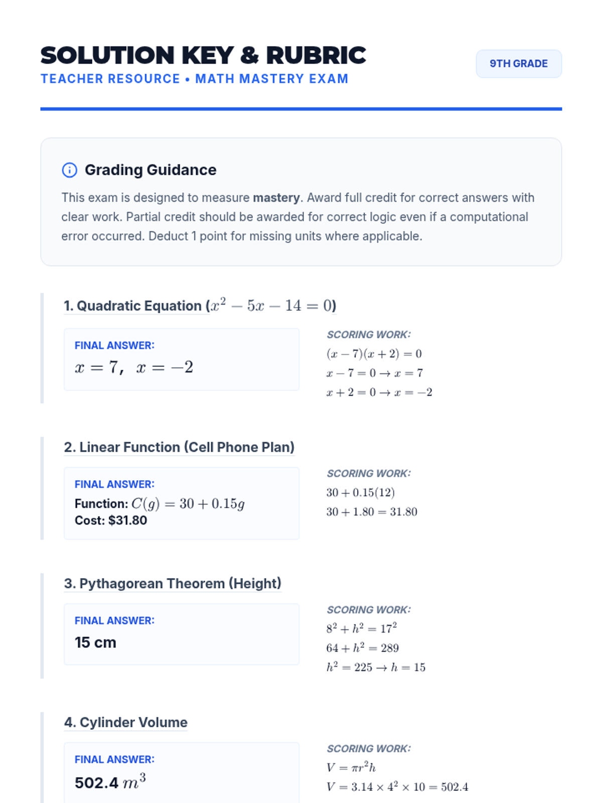 A detailed solution key and grading rubric for the Math Mastery Exam, providing step-by-step solutions and clear point allocation for teachers.