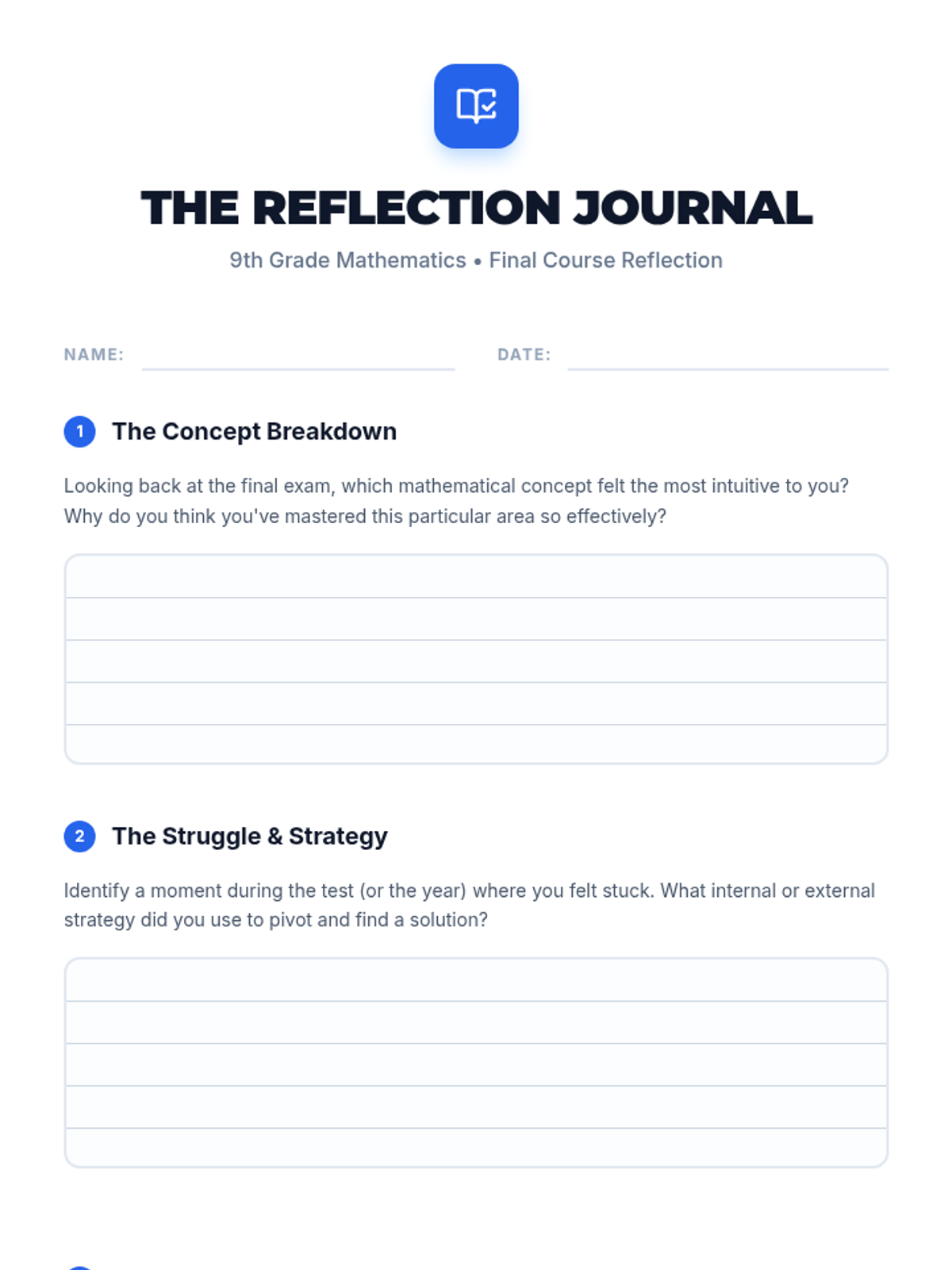 A post-test reflection journal for students to evaluate their performance, strategy use, and overall mathematical growth over the 9th-grade year.