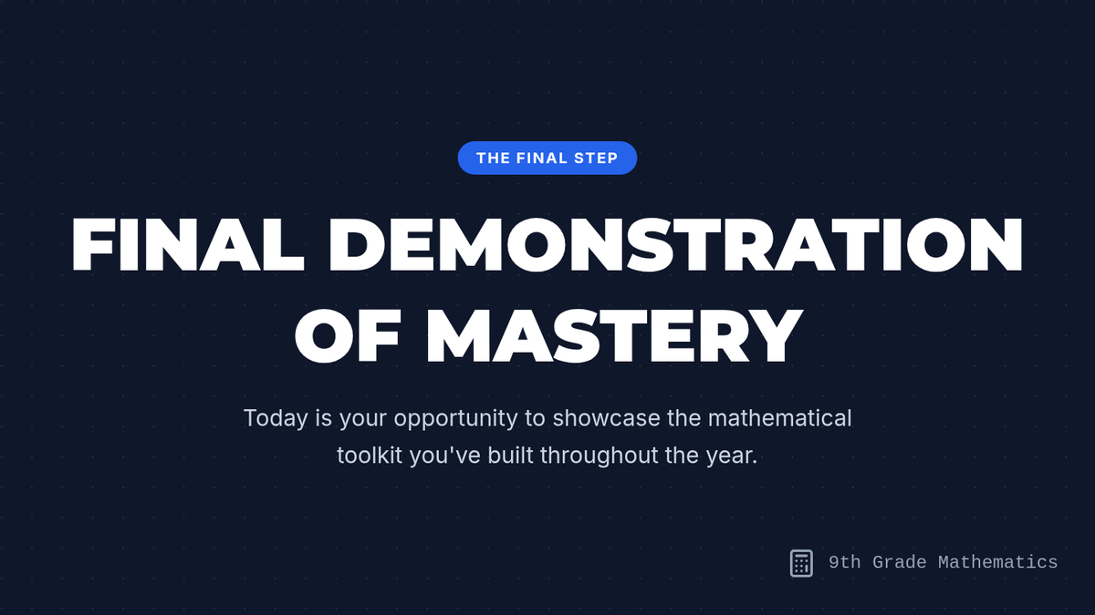 A high-impact slide deck for the 9th-grade math final, covering testing protocols, reflection prompts, and a concluding course celebration.