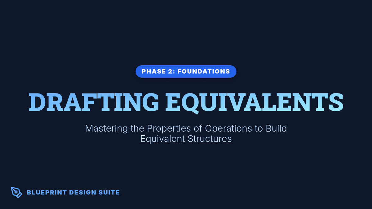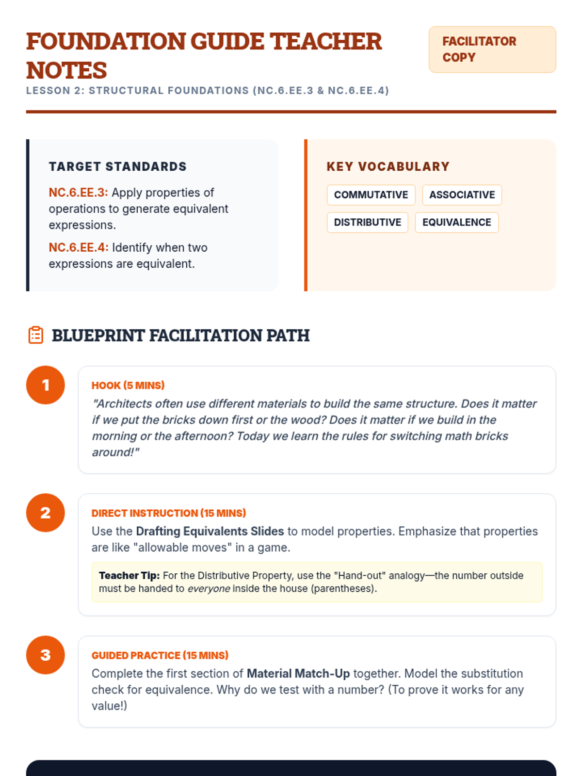 Instructional slides for Lesson 2 focusing on properties of operations (Commutative, Associative, Distributive) and strategies for identifying equivalent expressions. Features an architectural theme with clear visual examples and a step-by-step verification process. Revised for layout and contrast.