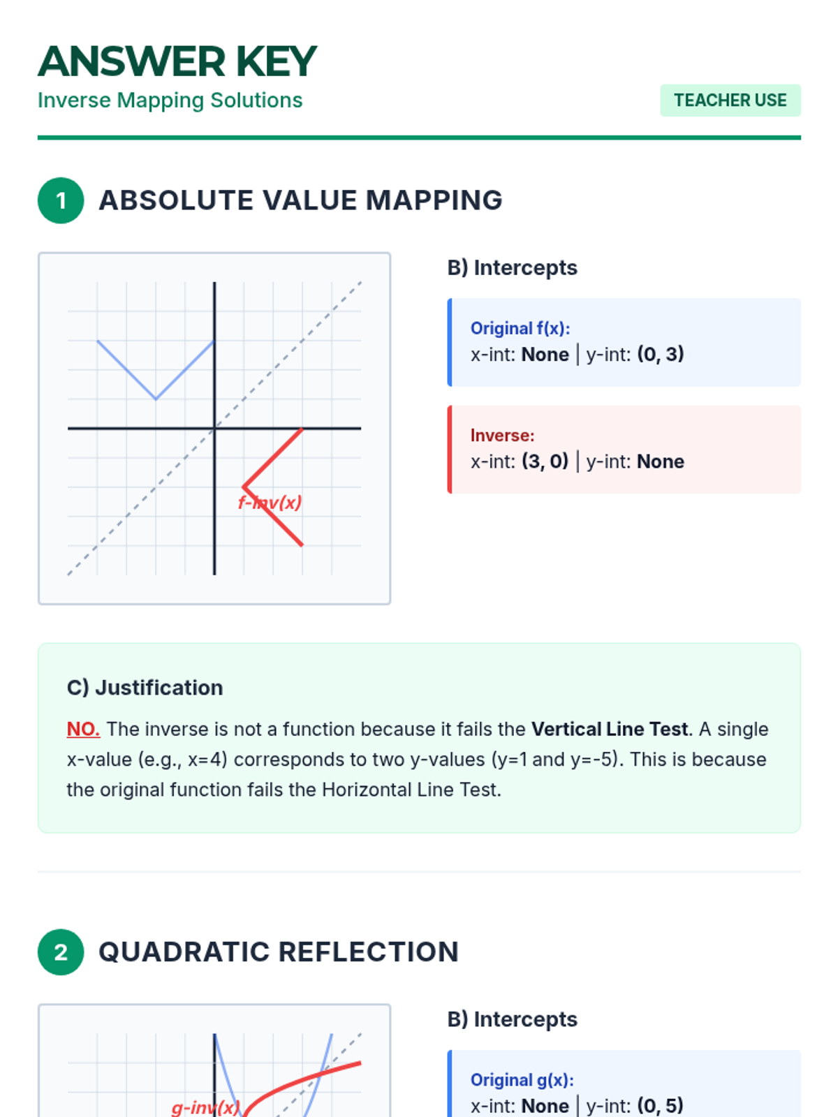Answer key for the Inverse Mapping Worksheet. Features corrected labels, enhanced line visibility, and simplified math notation for better rendering across all platforms. Adjusted for page breaks.
