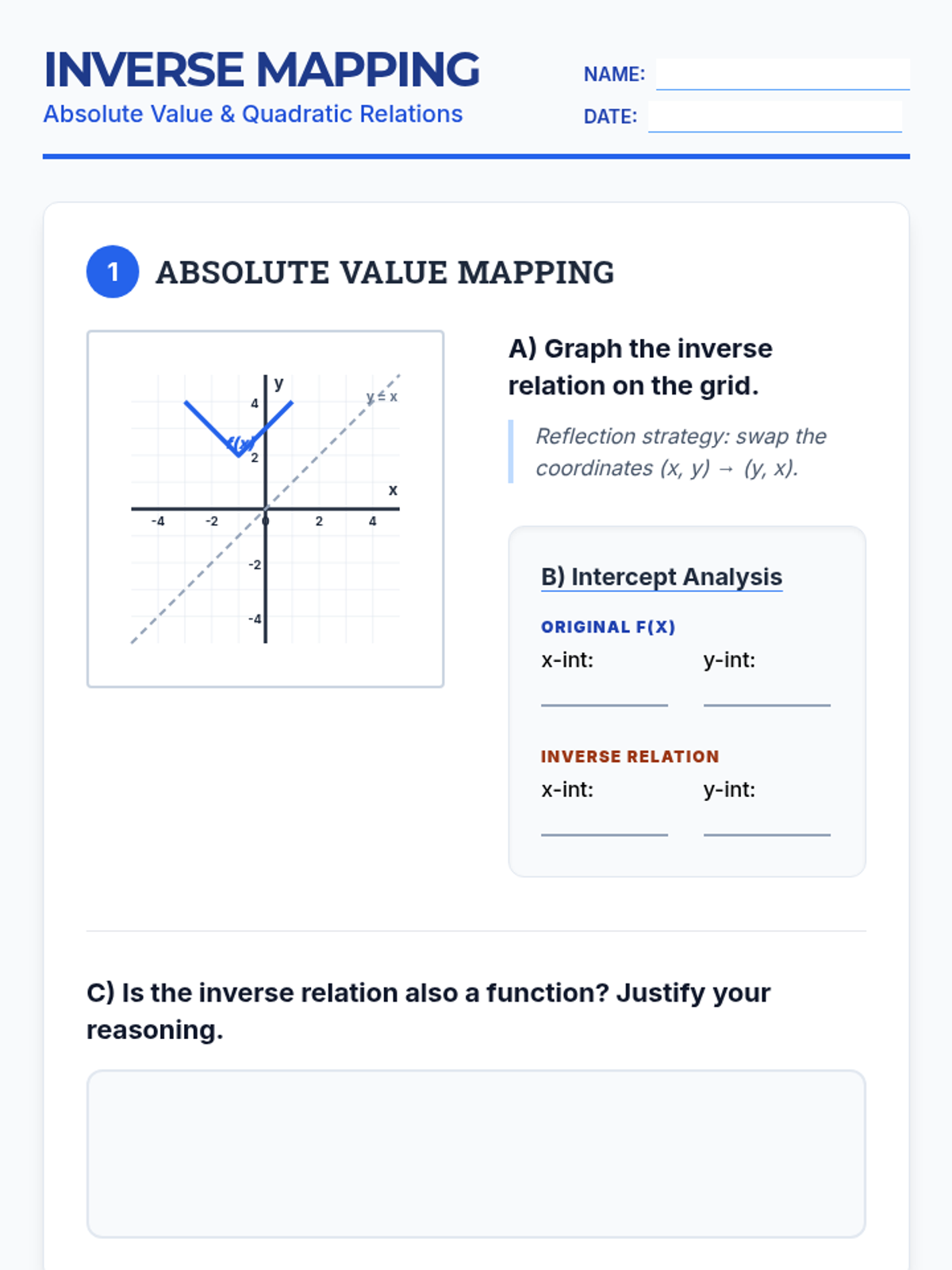 A math worksheet focused on inverse relations for absolute value and quadratic functions. Students graph inverse relations by reflecting points across y=x and analyze intercepts and function properties. Features clear axis labeling and high-contrast visuals.