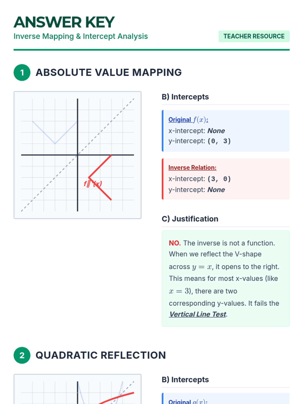 Detailed answer key for the Inverse Mapping Worksheet. Includes graphed inverse relations, accurately calculated intercepts, and formal justifications for function classification.