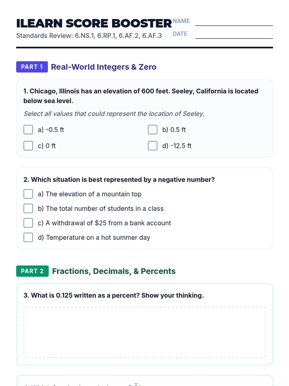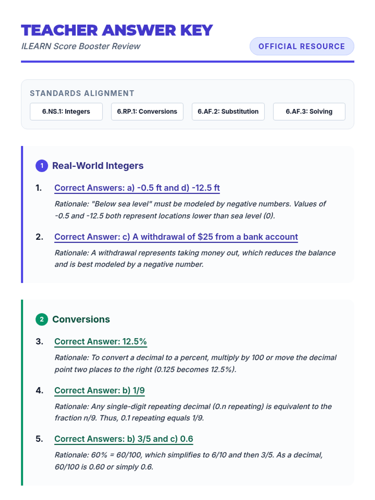 Teacher answer key for the ILEARN Score Booster Worksheet, providing correct answers, step-by-step rationales, and alignment to Indiana state standards for 6th-grade math review.