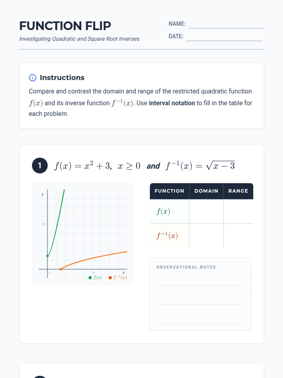 A 2-problem worksheet focusing on comparing the domain and range of quadratic functions and their square root inverses using interval notation and coordinate graphs. Restricted branches are used for mathematical accuracy. Includes improved writing space and page layout.