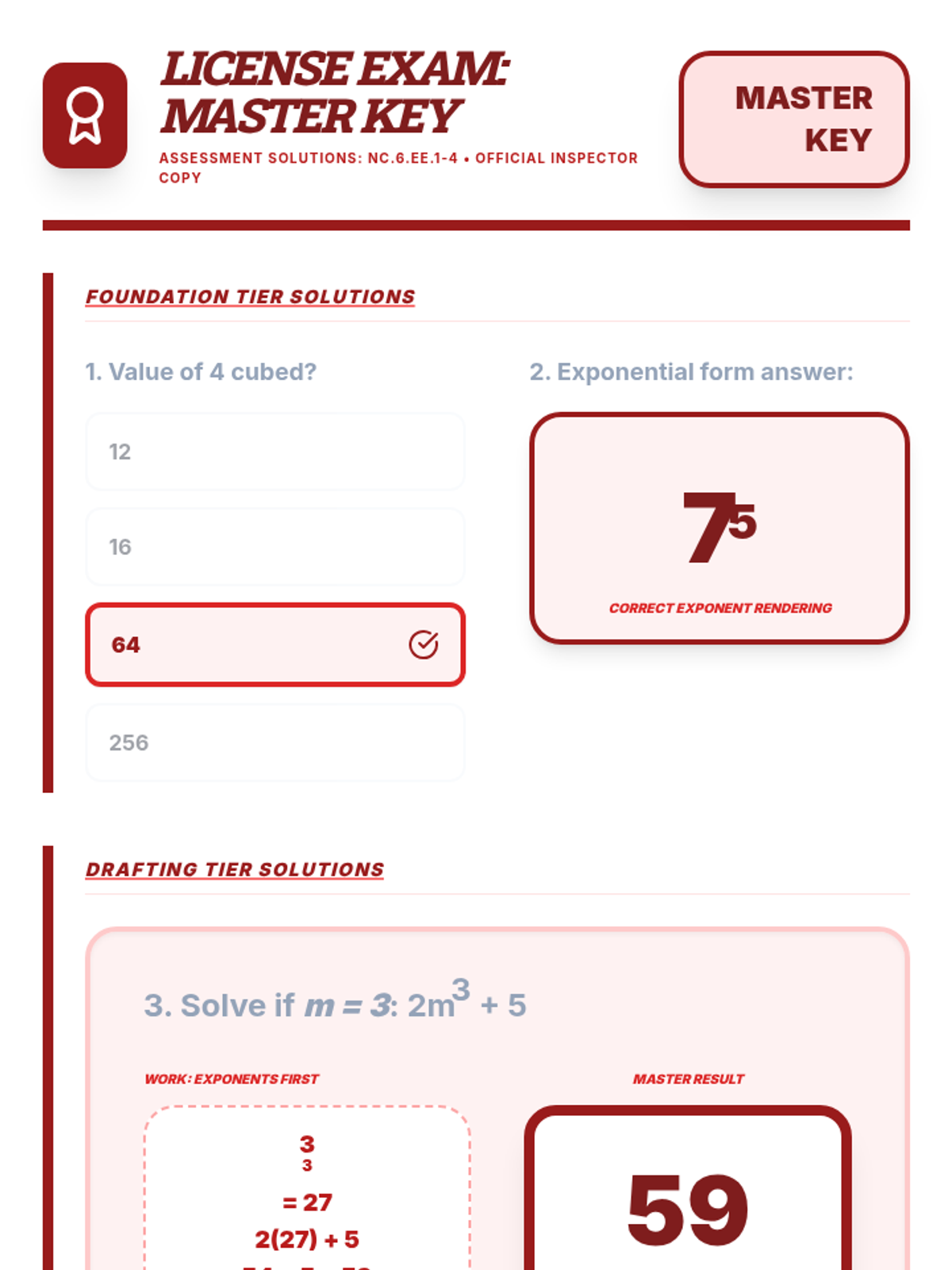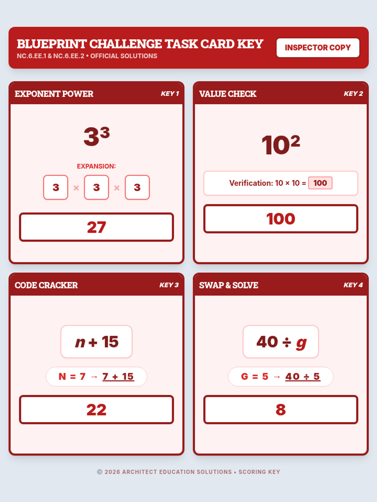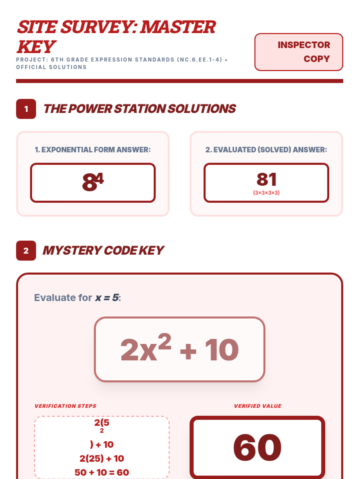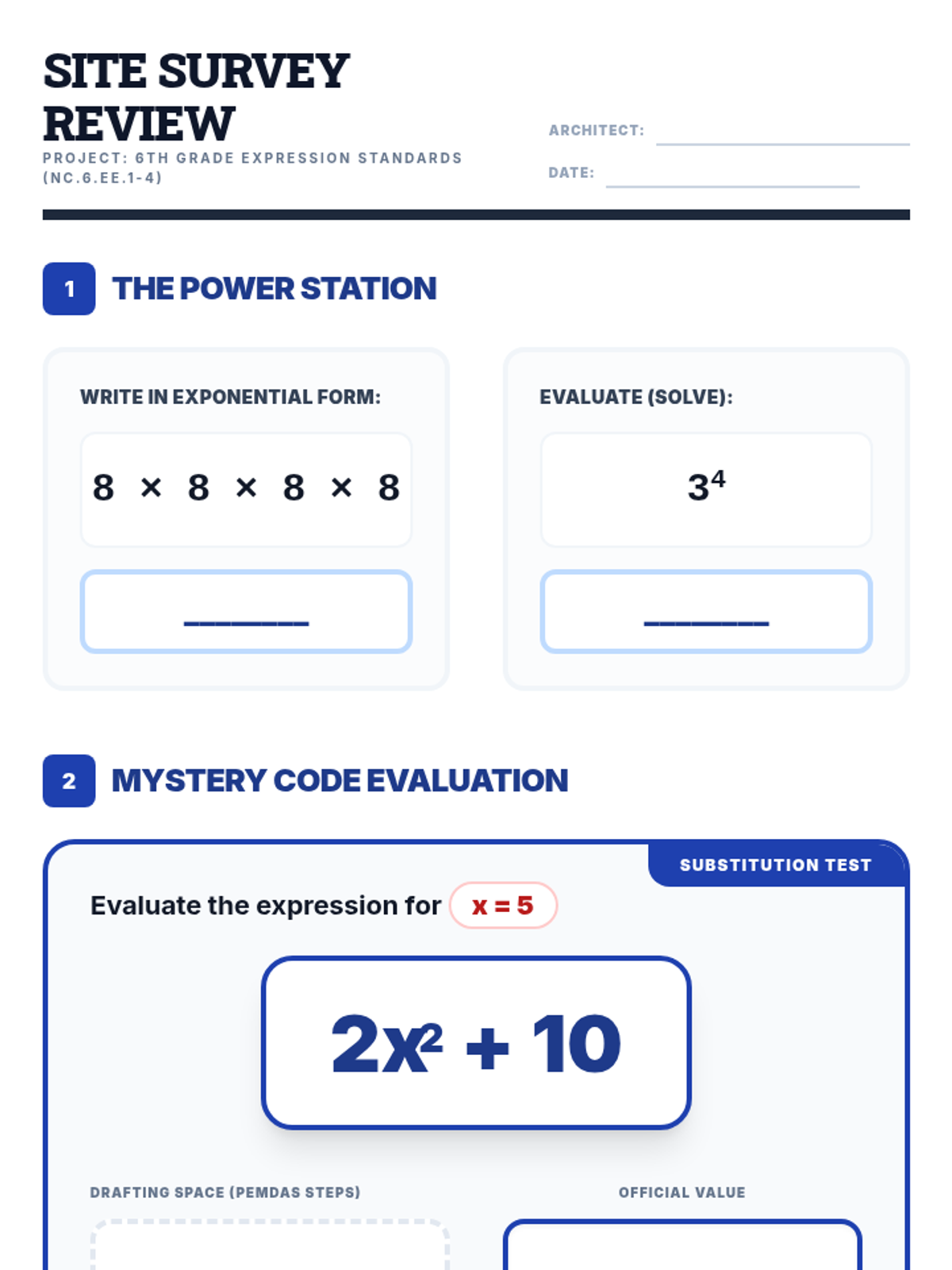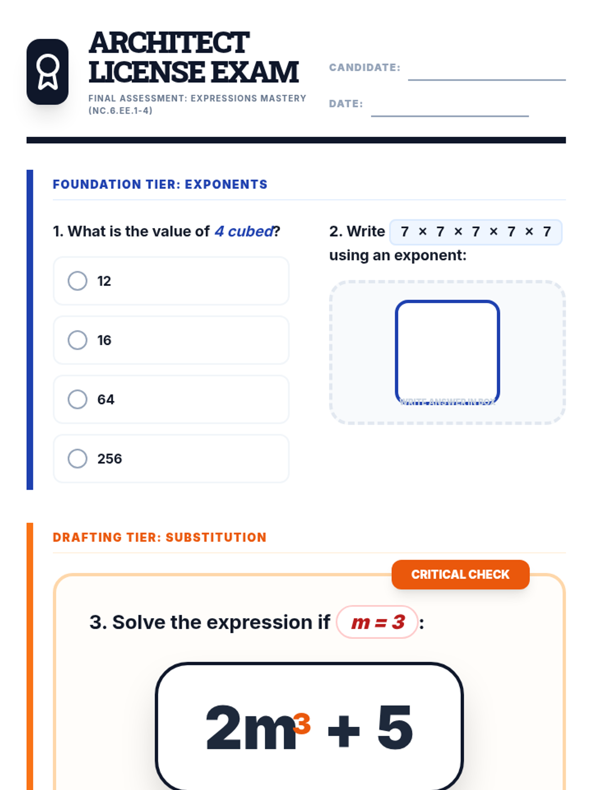 A 10-question final assessment for the Expression Architects unit. Covers exponents, substitution, and equivalent expressions. Revised for page breaks, text contrast, work area sizing, and question completeness (10 items).