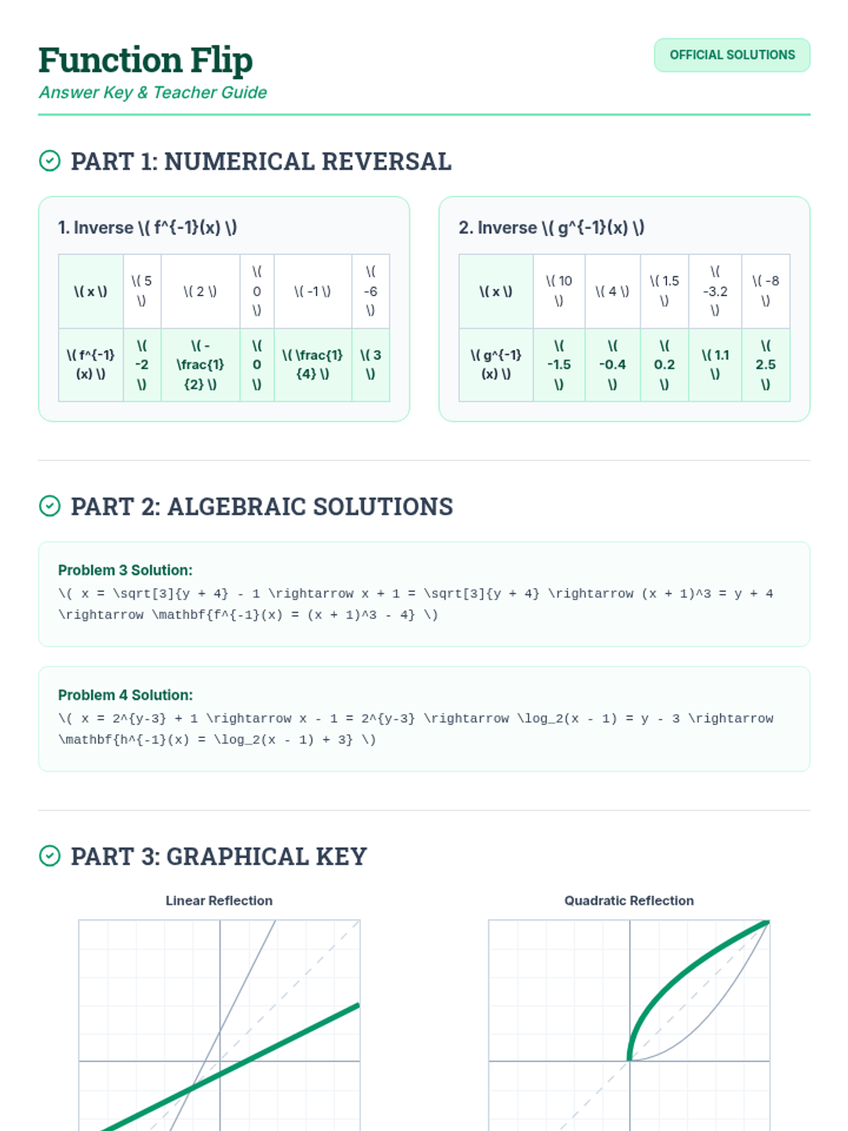 The answer key for the Inverse Flip Worksheet, featuring completed table mappings, step-by-step algebraic solutions for cubic and exponential functions, and reflected graphical representations for visual verification.