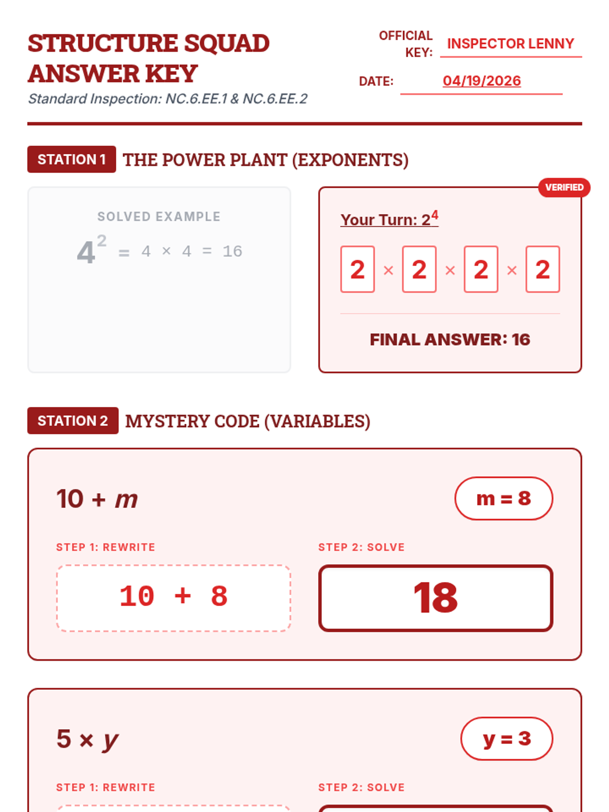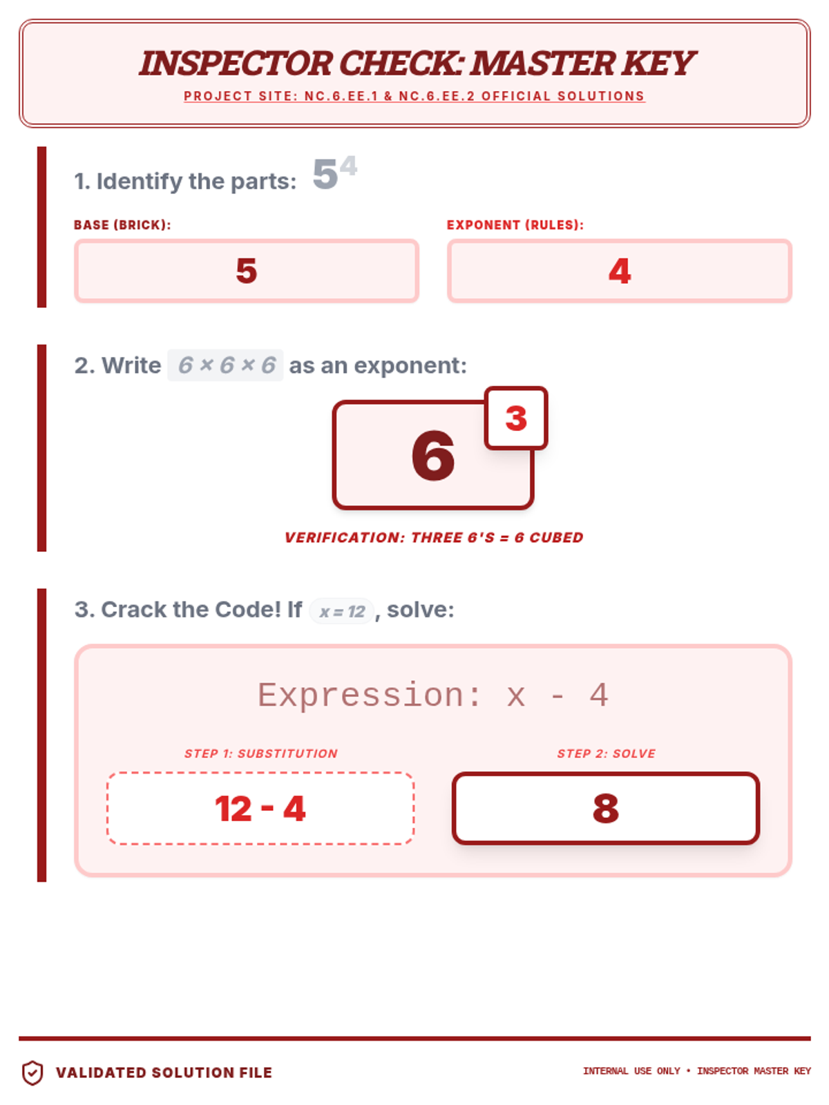 The official answer key for the Inspector Check Exit Ticket. Provides solved identifying parts, exponent notation conversion, and variable substitution with clear, high-contrast red annotations for teacher grading.