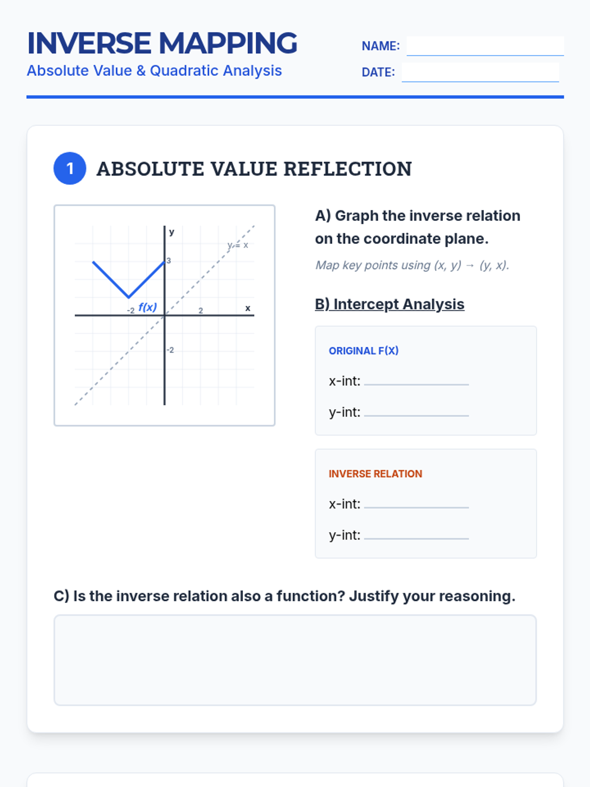 A math worksheet focused on inverse relations for absolute value and quadratic functions. Students graph inverse relations by reflecting points across y=x and analyze intercepts and function properties. Adjusted for better printing and clarity.