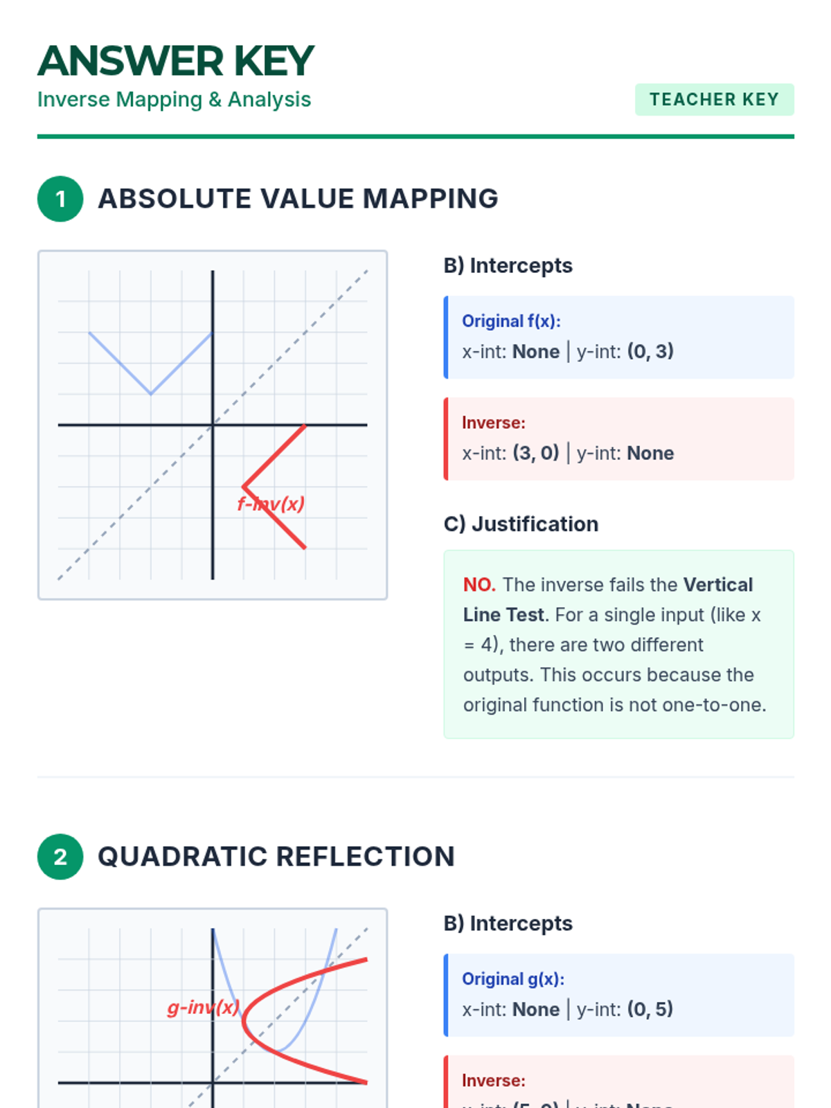 Answer key for the Inverse Mapping Worksheet. Features corrected labels, enhanced line visibility, and simplified math notation for better rendering across all platforms.