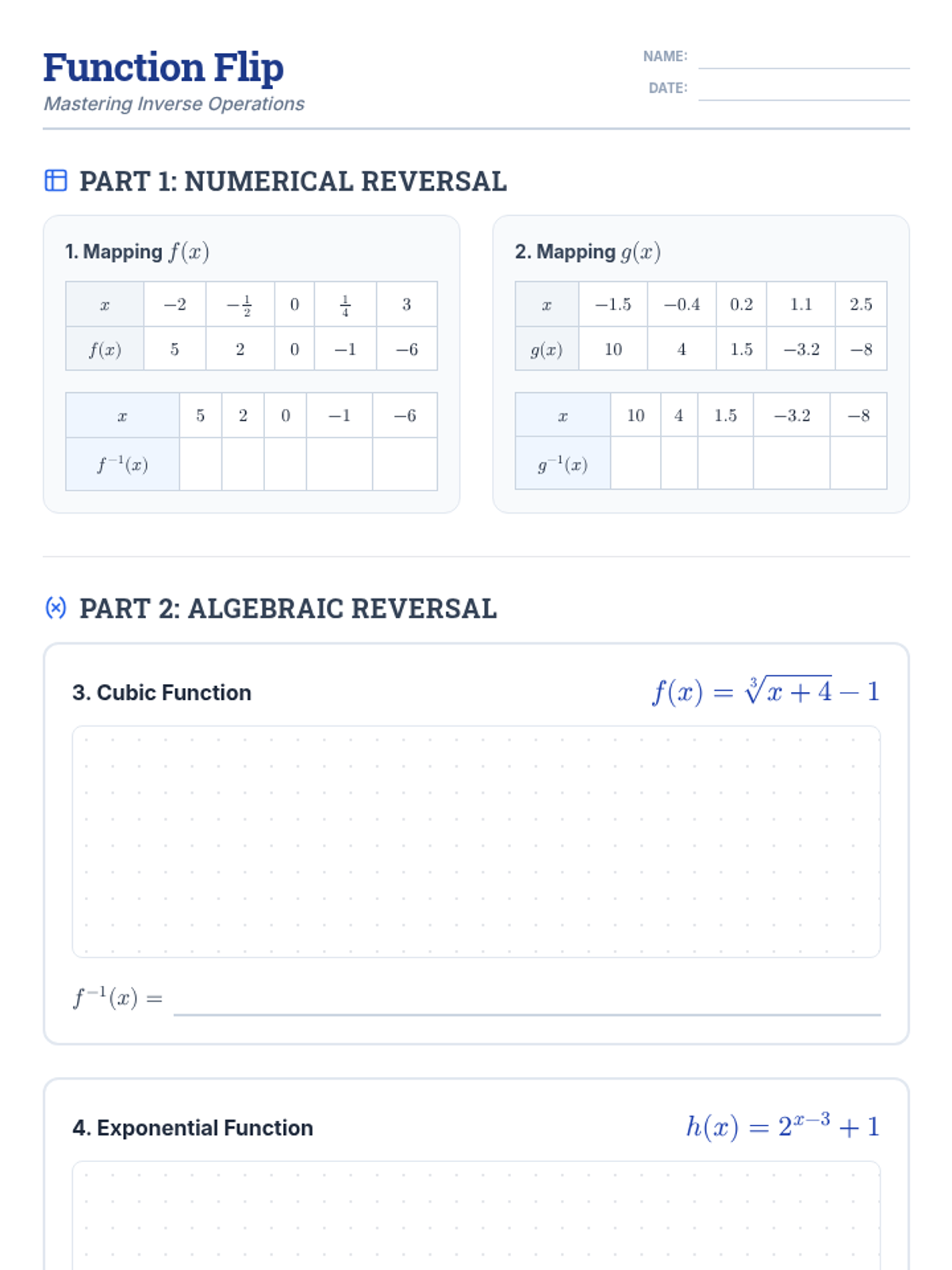A comprehensive worksheet on inverse functions featuring table mapping, algebraic manipulation, and graphical reflections across the line y=x. Includes fractions, decimals, and multiple function types (linear, quadratic, cubic, exponential, square root).